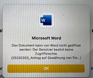Word: Zuletzt verwendete: Dateien von gestern, aber die von heute - außer die zuletzt gespeicherte - weg. Ein einziges Word-Formular von heute tauchte in der Word Liste auf, ließ sich aber nicht aufrufen: Fehlermeldung: 'Das Dokument kann nicht geöffnet werden: Der Benutzer besitzt keine Zugriffsrechte.'