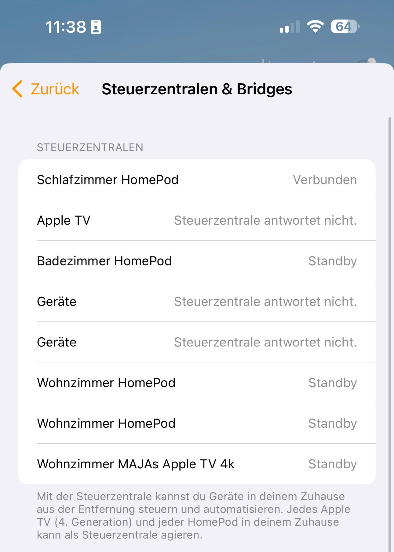 ich habe ein Problem mit meinem Homekit. In meinen Zuhause befinden sich Steuerzentralen, die nicht antworten, da ich diese Gerät gar nicht besitze. Sie werden mir auch nicht unter Geräten bzw. im Standardraum etc. angezeigt. Auch im Bereich iCloud unter Geräte finde ich diese Geräte bzw. das Apple TV nicht. Kennt jemand eine Lösung, die Steuerzentralen zu entfernen ohne das ganze Zuhause zu löschen und neu einzurichten?