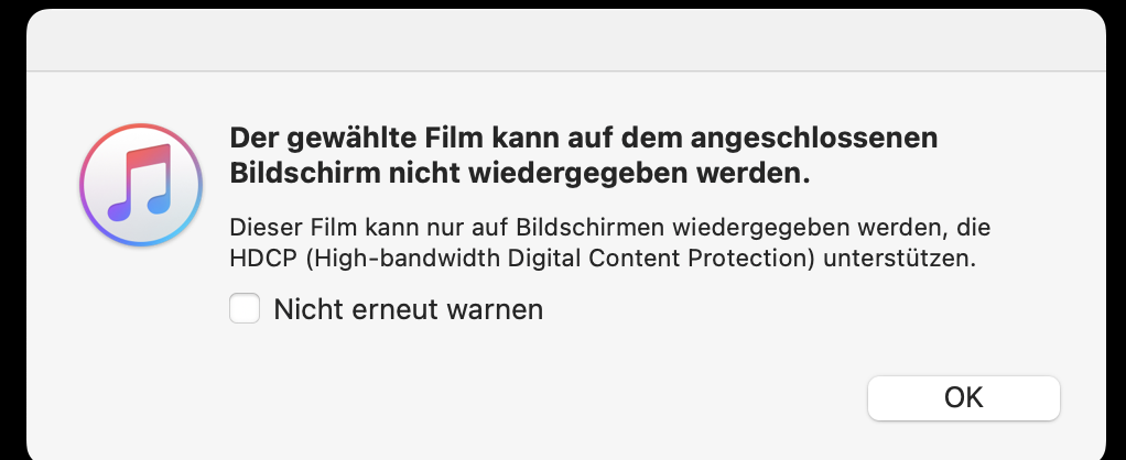 Immer wieder kann ich über mein Mac Book bei ITunes gekaufte Filme nicht auf demselben MacBook abspielen (bei Benutzung des Mac eigenen Bildschirms)