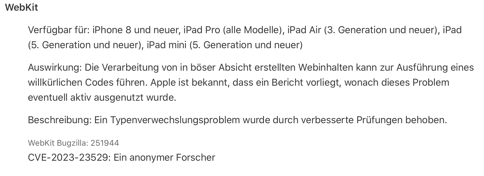Allerdings bedeutet das nicht, dass iOS-Geräte vollständig immun gegen Schadsoftware sind. In seltenen Fällen kann eine schädliche App durch die Überprüfungsrichtlinien von Apple fallen und auf das Gerät gelangen. Außerdem können andere Arten von Angriffen, wie Phishing-E-Mails oder bösartige Websites, dazu führen, dass Benutzer unwissentlich Malware auf ihr Gerät herunterladen. Exemplarisch zutreffend und gefixt durch das Sicherheitsupdate iOS 16.3.1.