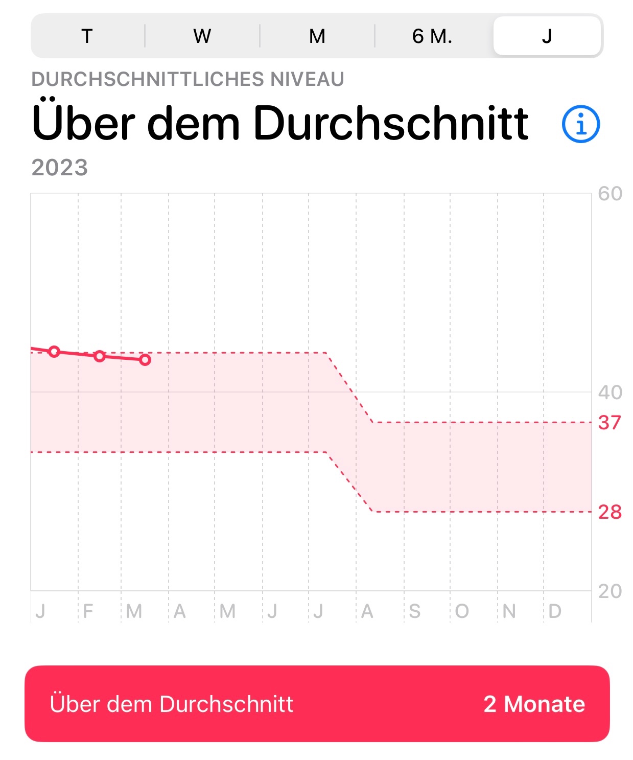 Hallo zusammen. Ich werde im August in der Health App in einer neuen Altersgruppe betreffend das Cardiofitness-Niveau eingestuft. Ist es möglich, dass deshalb mein Fitnessniveau langsam sinkt, obwohl ich definitiv noch genau so fit bin, wie vor einem Jahr?