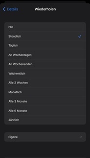 Beim Anwählen von ,Wiederholen‘ erscheint eine Liste in der an zweiter Stelle ,Stündlich‘ aufgeführt ist.