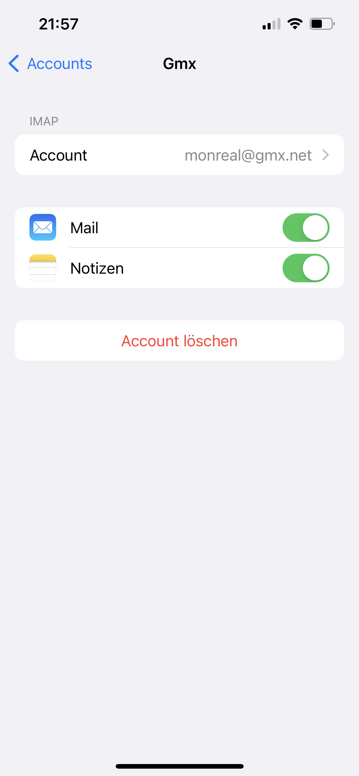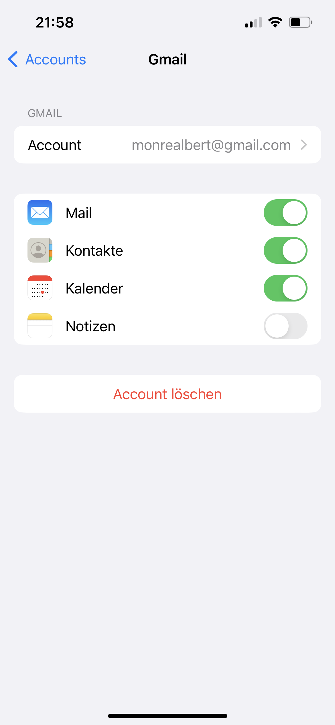 Stelle sicher, dass du beim Einrichten so vorgegangen bist, wie hier beschrieben: Einrichten von Accounts für Mail, Kontakte und Kalender auf dem iPhone - Apple Support (DE)