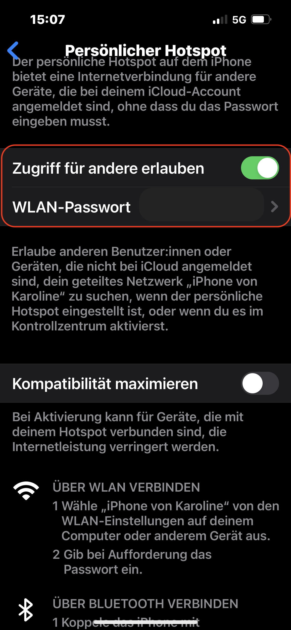 Hier kannst du den Zugriff für andere erlauben und diesen mit einem persönlichen Passwort sichern. Weiter unter siehst du noch die Zugriffsmöglichkeiten über WLAN, Bluetooth oder über eine Kabelverbindung. Hier habe ich noch einen weiteren Link für dich. Teilen der Internetverbindung vom iPhone - Apple Support (DE)