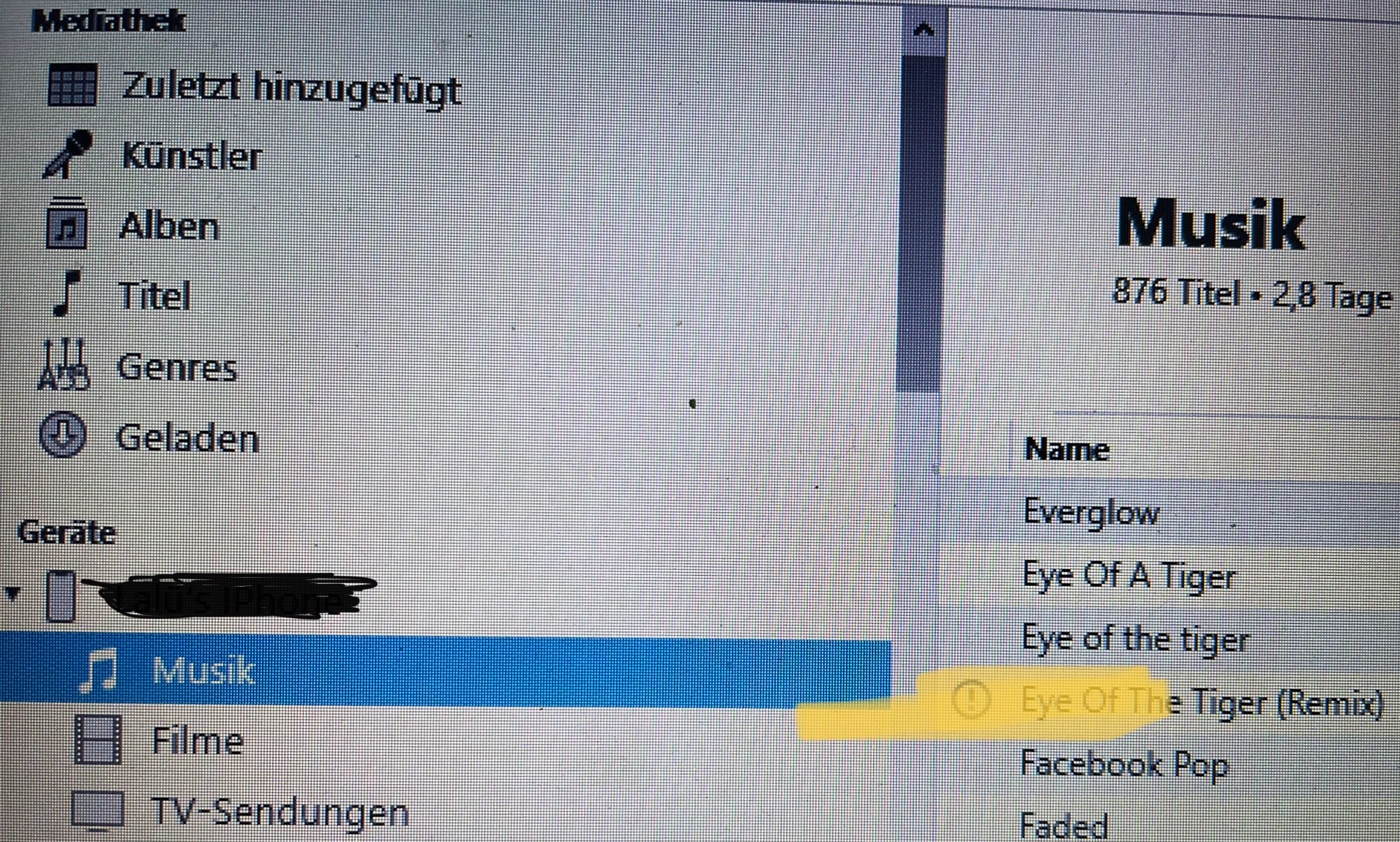 Ich habe Lieder in meiner Mediathek unter Titel, die problemlos abspielbar sind. Sobald ich meinen IPhone anschließe und den Song probiere in der Playlist unter meinen IPhone Gerät abzuspielen, habe ich das Ausrufezeichen vor meinen Titel. Der Titel ist auch auf meinen IPhone in der Music App ausgegraut. Wie oben bereits erwähnt, ist es komisch, denn der Titel ist abspielbar und funktioniert in der Mediathek. Ich habe schon sämtliche Sachen ausprobiert wie z. B. Mediathek organisieren, Titel entfernen, hinzufügen etc.