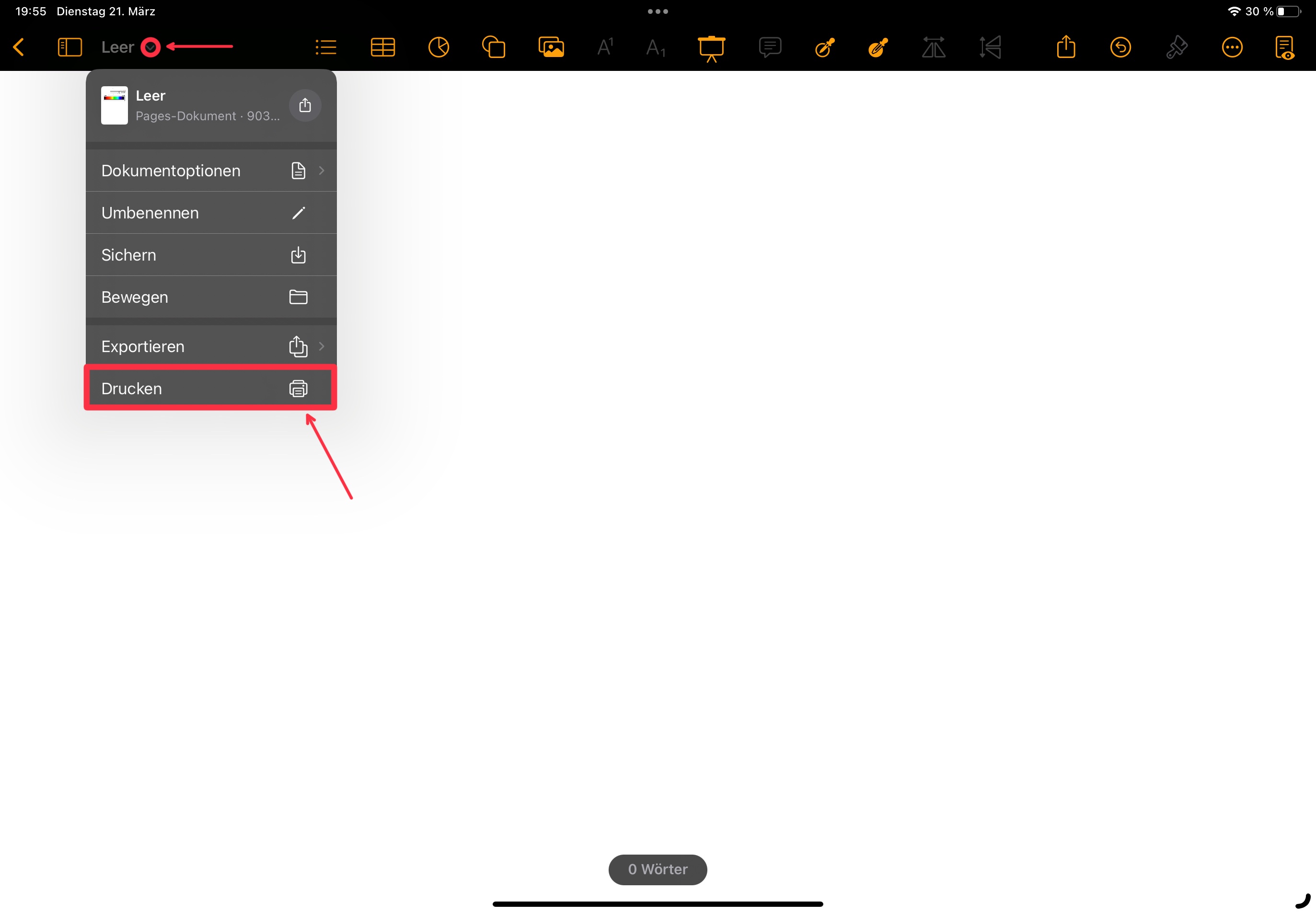 Habe auf meinem iPad Pro 11 von Pages die Version 12.2.1. Warum kann ich kein Dokument drucken ? Ich finde auch keinen Button DRUCKEN.
