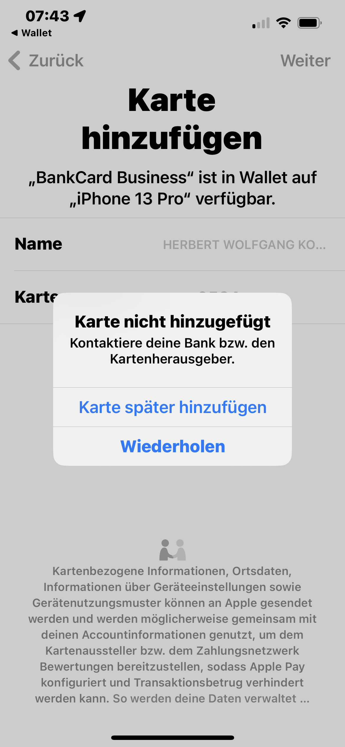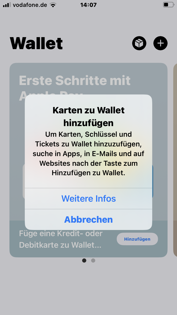 ich versuche schon seit geraumer Zeit meine Kreditkarte zu Wallet hinzuzufügen, um Apple-Pay zu nutzen.