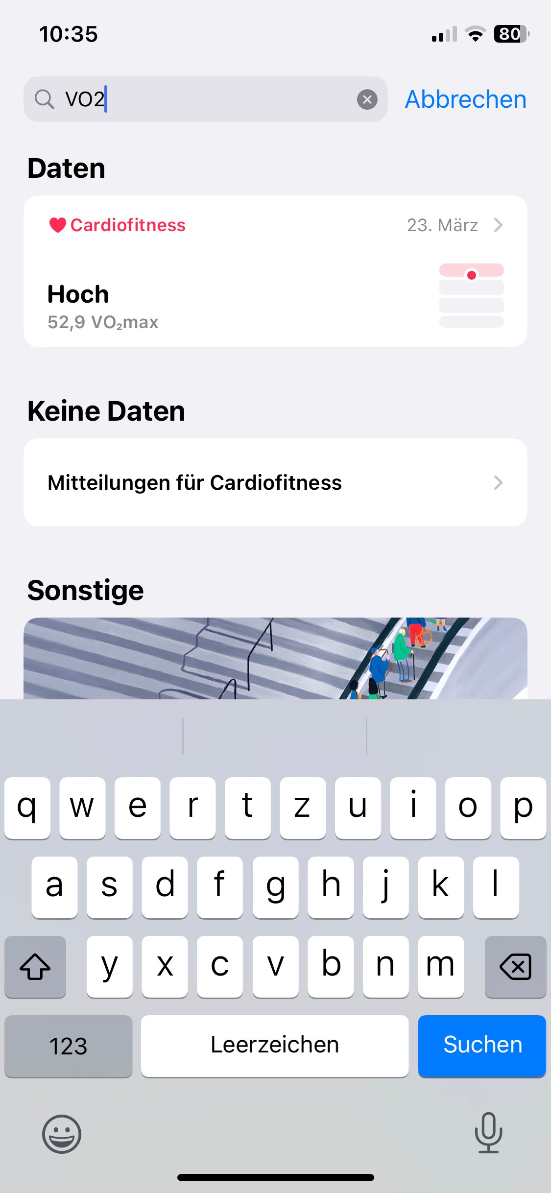 Dir sollte nun der passenden Eintrag (Cardiofitness) angezeigt werden. Mit einem Tipp darauf erhältst du weitere detailierte Infos zu deinem VO2 Max Wert: