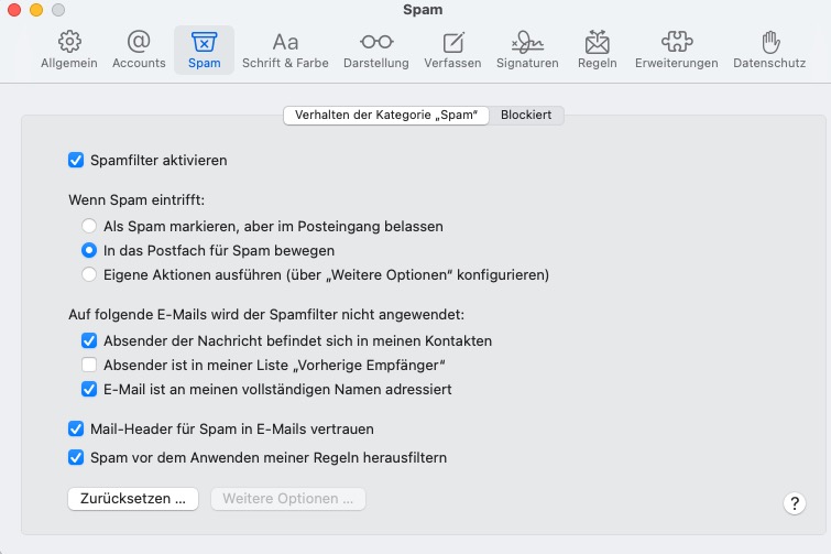 Nun kommen meine eigenen Mails (von meinem eigenen email-account) nicht mehr unter "gesendet" an, sondern landen im eigenen Spamordner.