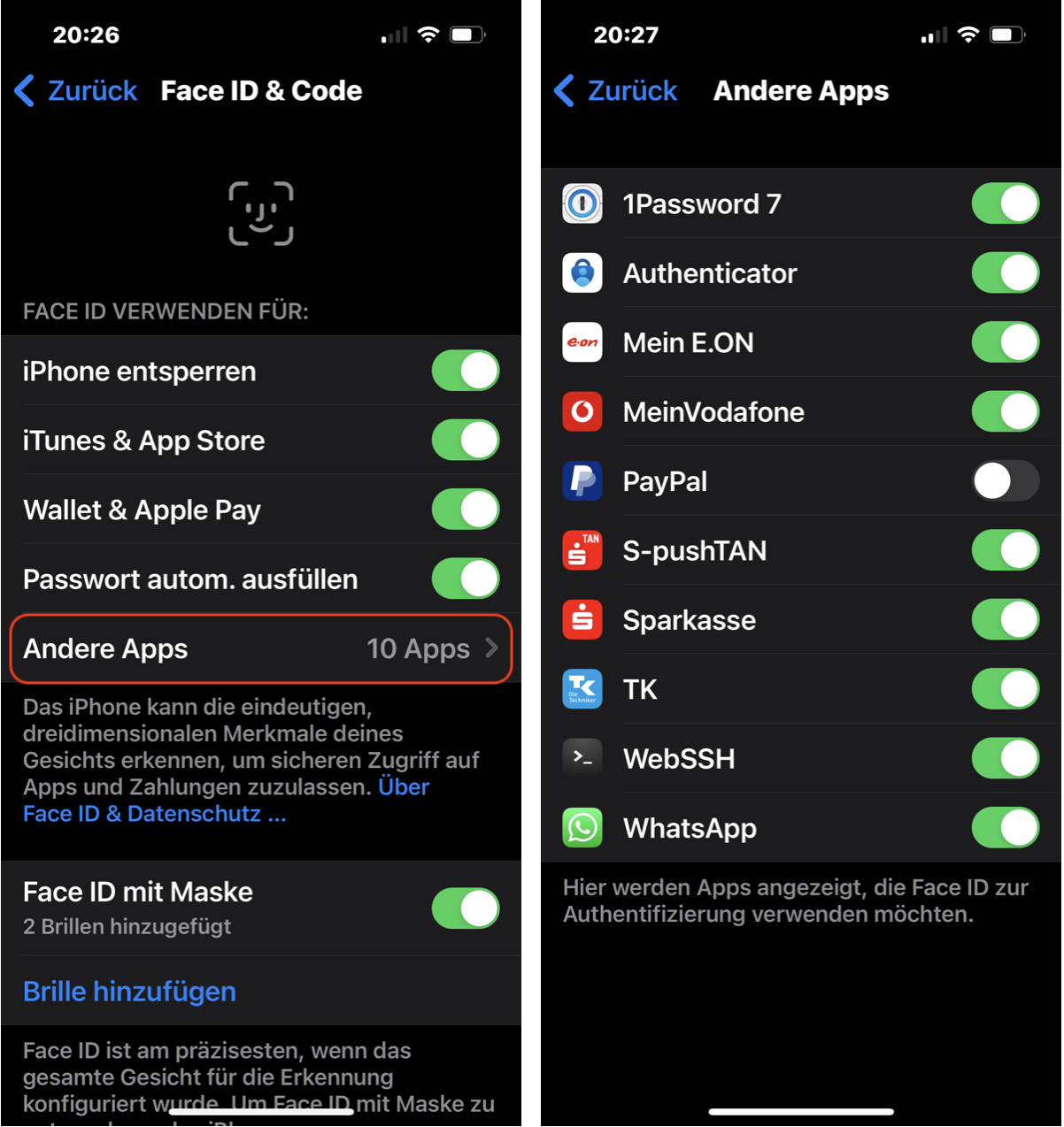 Tippst du danach auf "Andere Apps", wird dir angezeigt, welche Apps du mit Face ID entsperren kannst.