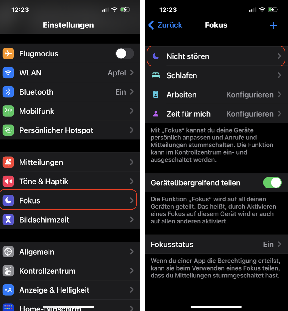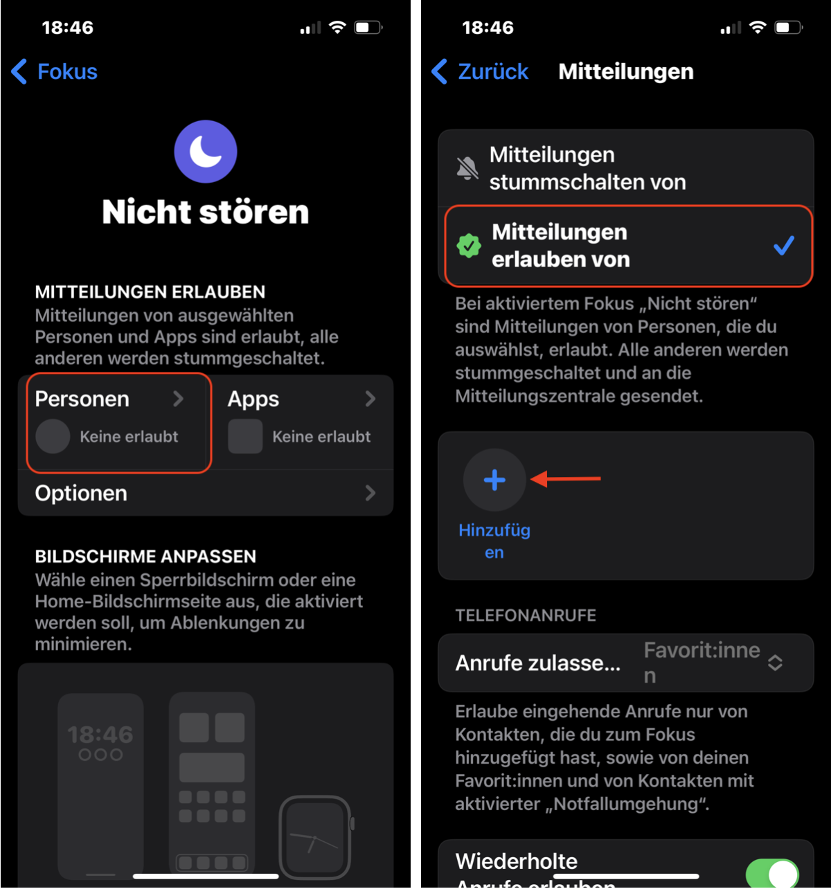 Im Fokus "Nicht stören" kannst du festlegen, von welchen Apps und Kontakte trotzdem Mitteilungen durchgelassen werden. Um bei "Fokus" deinen Kontakt als erlaubt einzurichten, gehe bitte wie folgt vor.