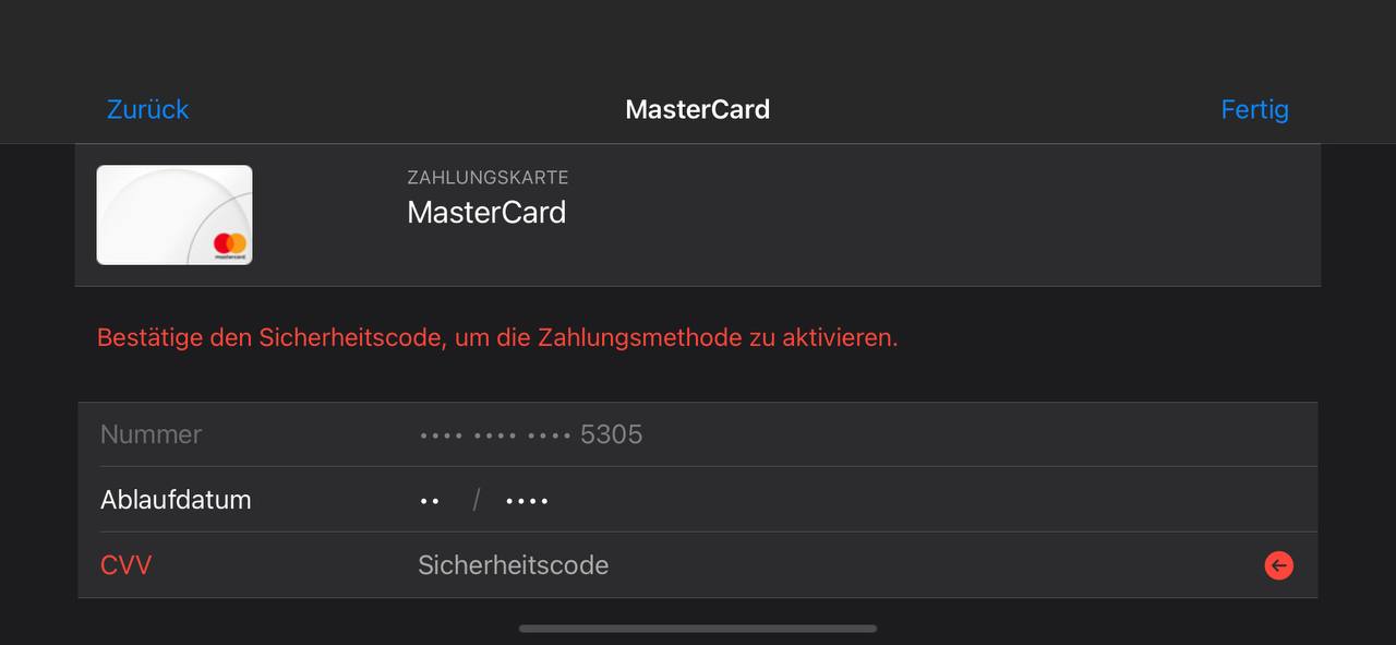 Danach kommt die FaceID etc und dann landet er in einer Ansicht, wo er meine Kreditkarte sieht mit fehlende CVV Nummer. Ich habe versucht diese dort einzutragen und dann auf "Fertig" zu klicken. Leider funktioniert der Link rechts oben in der Ecke einfach nicht. Gleiches passiert auch, wenn ich über PayPal bezahlen möchte. Da bekomme ich eine SMS mit einer PIN. Diese kann ich dann eingeben, aber auch hier funktioniert "Fertig" rechts oben nicht. Es passiert einfach nichts. Anbei ein Screenshot: