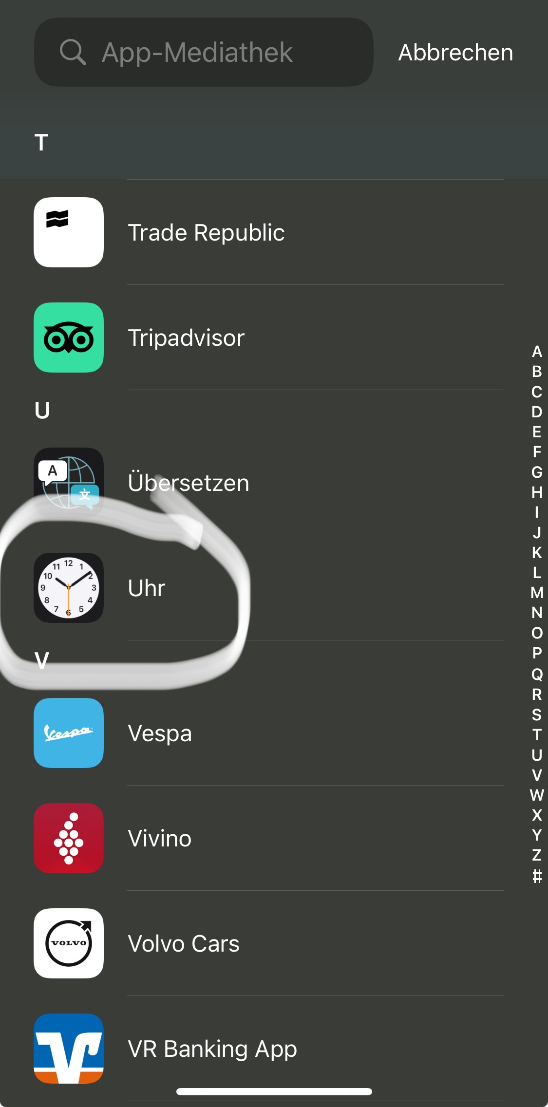 Wische auf deinem iPhone ganz nach rechts, bis du die App Mediathek siehst. Gebe oben in das Suchfeld "Uhr" ein. Wird dir die Uhr App angezeigt?