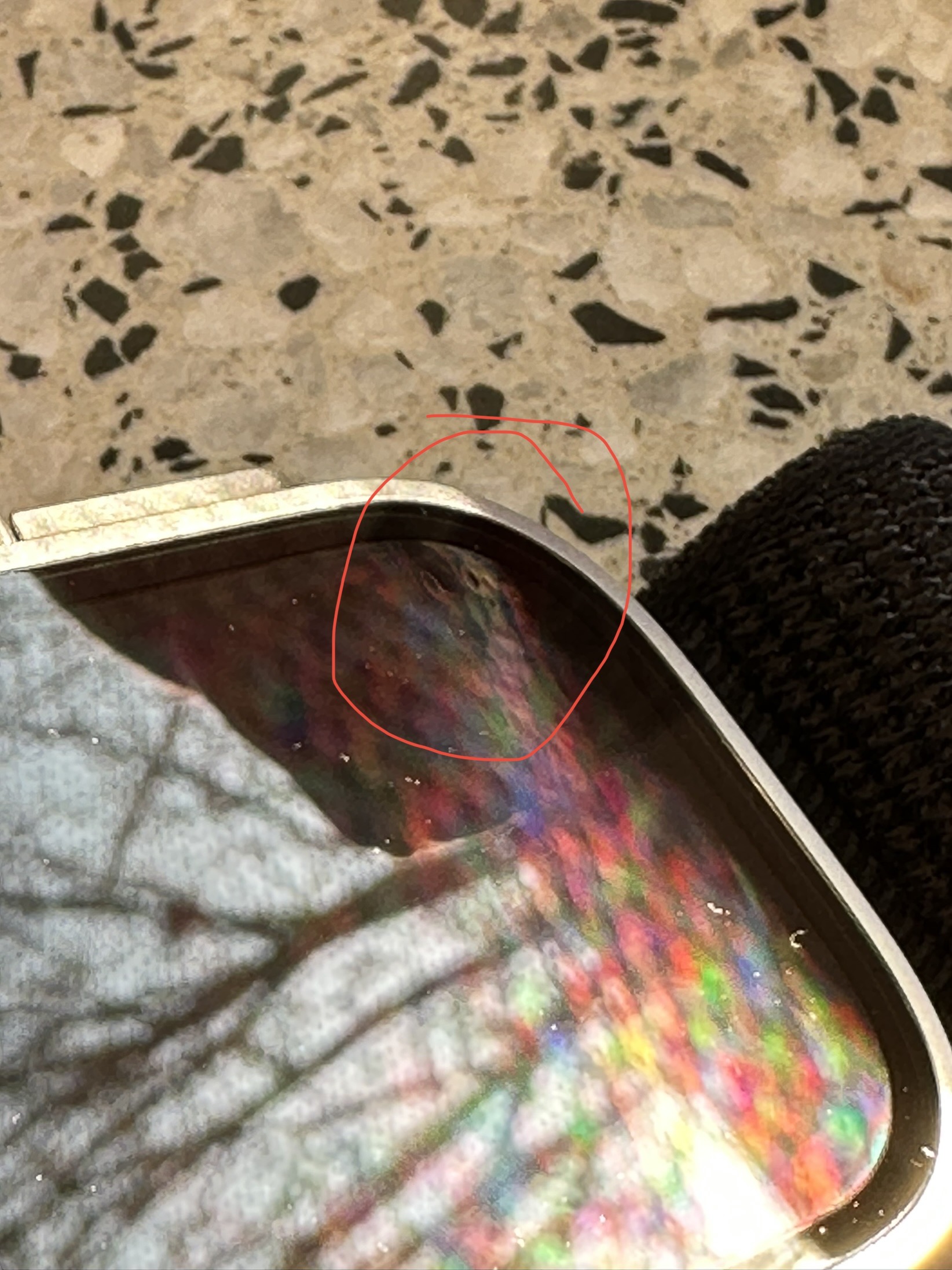 Dann ging ich allerdings in die Sonne und habe gesehen, dass das Saphirglas ein paar Stellen aufweist, die bei normalen Lichtverhältnissen nicht sichtbar waren. In der rechten unteren Ecke sieht es aus, als sei eine Delle (ein wenig wellenförmig) unter dem Glas.
