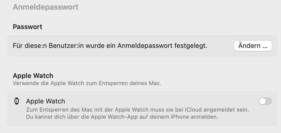 Habe versucht, in der Systemsteuerung unter "Anmeldepasswort" und "Apple Watch" den ausgegrauten Botton einzuschalten - ohne Erfolg, springt immer wieder auf Off zurück. In vorigen Versionen bzw. vor Update von macOS hat das funktioniert.
