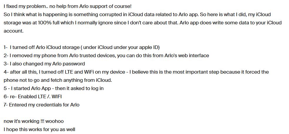 Ich benutze seit dem letzten September die Arlo Secure App. Vor ein paar Tagen nun verlangte die App, dass ich mich wieder neu einloggen sollte. Habe ich gemacht, resp. wollte ich machen nur hat es nicht funktioniert. Nach ein paar erfolglosen Versuchen habe ich die App gelöscht (lange auf das Icon tippen - App entfernen). Dann habe ich das Handy neu gestartet und die App wieder aus dem App Store heruntergeladen. Das Problem ist nun aber, dass die App anscheinend nicht mehr komplett lädt oder sich komplett installiert, denn auf dem Anmeldebildschirm erscheint nun nur noch das Firmenlogo, aber unterhalb wo bisher die Anmeldedaten (Benutzernamen und Login) erschienen sind, ist alles leer. D.h. es gibt gar keine Möglichkeit mehr, die Anmeldedaten einzugeben.