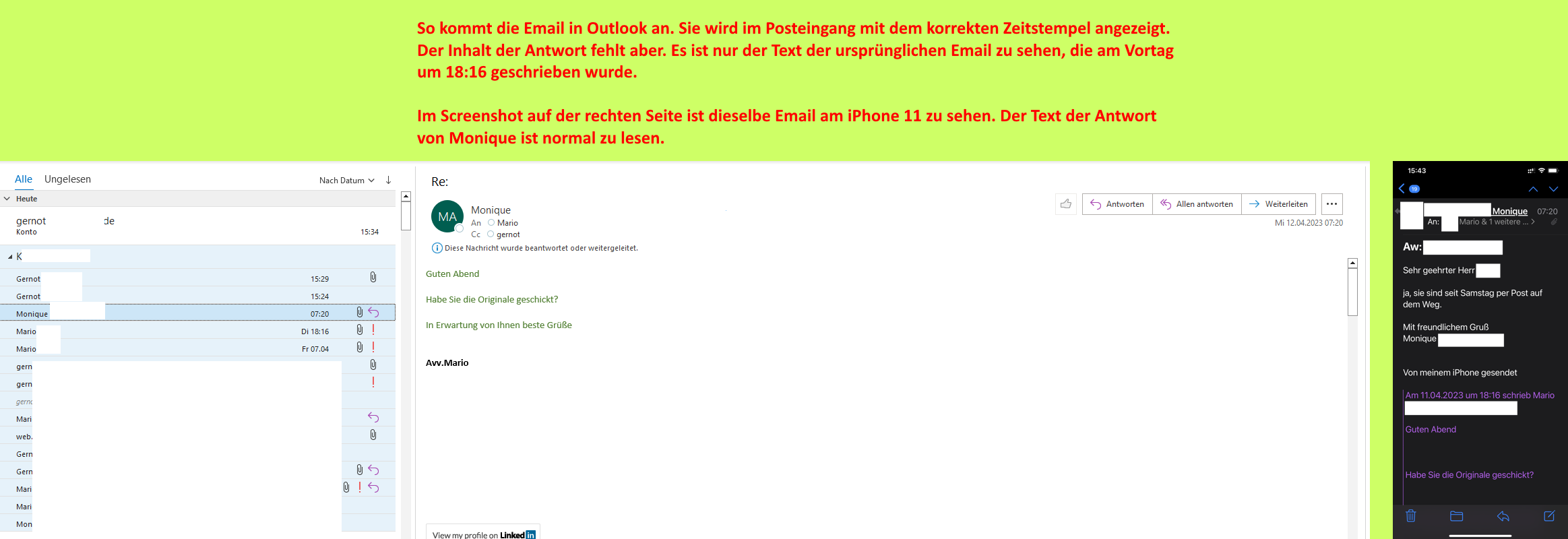 Meine Frau hat eine Email auf ihrem iPhone 7 beantwortet. Auf meinem iPhone 11 als auch am iPad Pro kann ich ihre Antwort in der Apple Mail App lesen. In Outlook (Microsoft365) am PC wird ihre Email im Eingang angezeigt. Aber der Email fehlt ihr Antworttext. Es ist nur der Text der Email zu sehen, auf die sie geantwortet hat. Auch der andere Empfänger kann auf seinem PC ihren Text in ihrer Antwort in Outlook nicht sehen. Ich habe ein Bild beigefügt, in dem die Screenshots aus Outlook und vom iPhone zu sehen sind.
