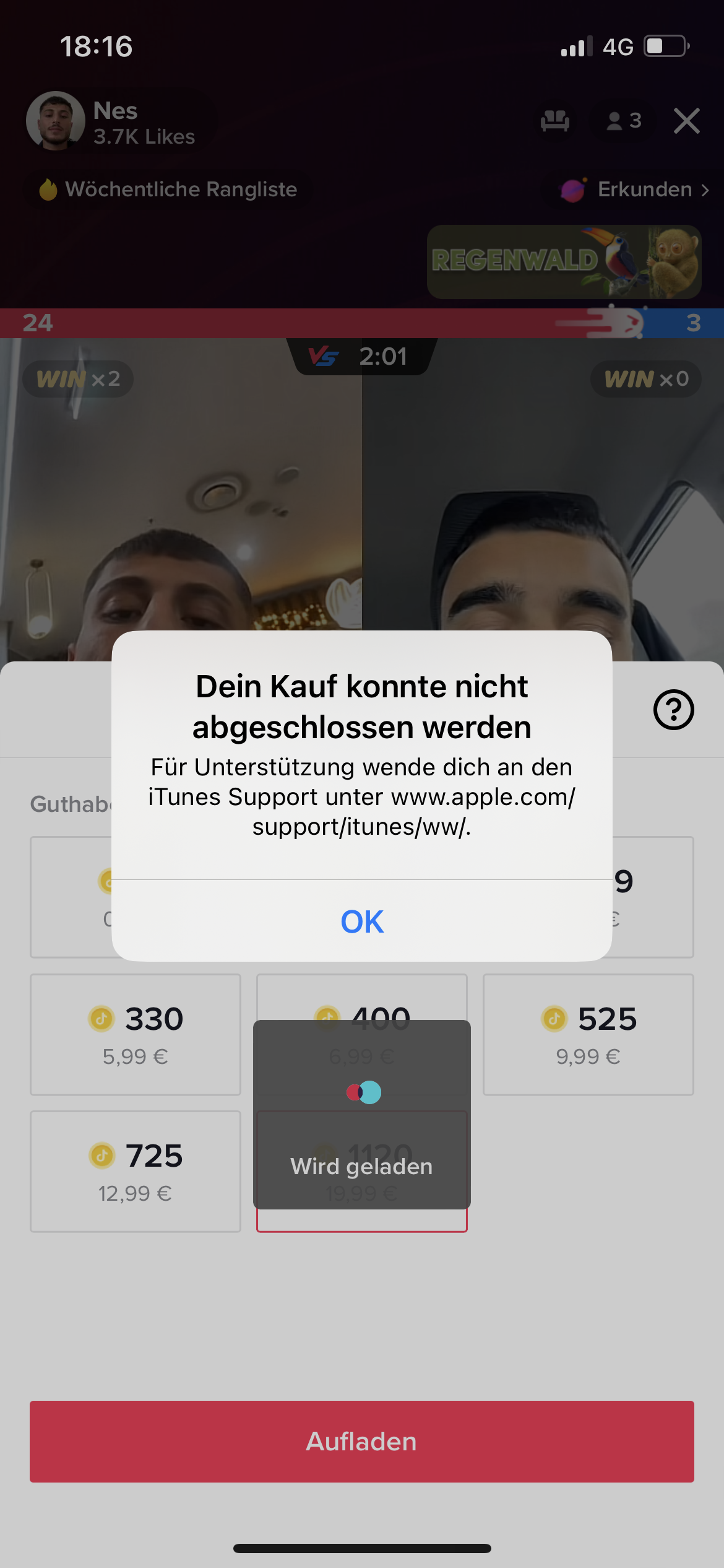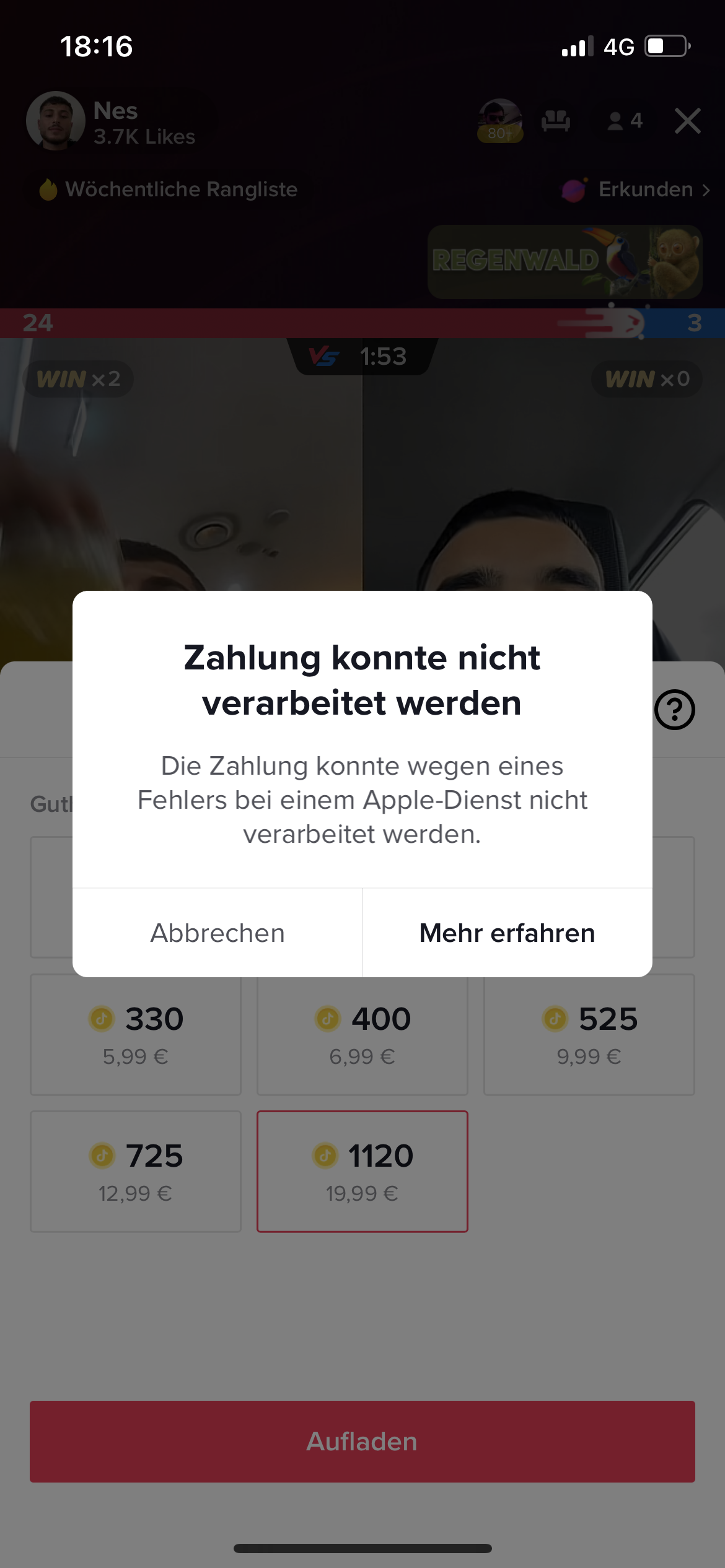 habe eben eine iTunes Karte für 50 gekauft und eingelöst, aber wenn ich bei TikTok Guthaben aufladen möchte zeigt der mir ZAHLUNG KONNTE NICHT VERARBEITET WERDEN