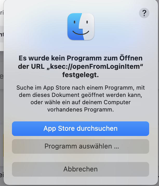 Es wurde kein Programm zum Öffnen der URL „ksec://openFromLoginItem" festgelegt.