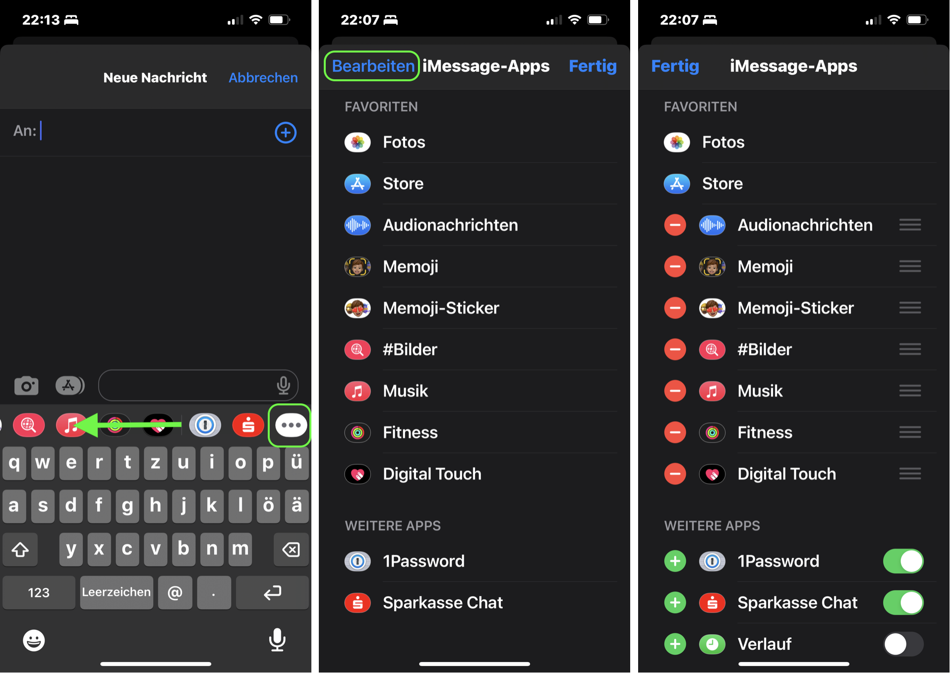 Wie du auf dem rechten Bild sehen kannst, hast du die Möglichkeit, Apps zu entfernen oder hinzuzufügen. Tippst du später auf "Fertig", wird die von dir ausgewählte Liste unten angezeigt.