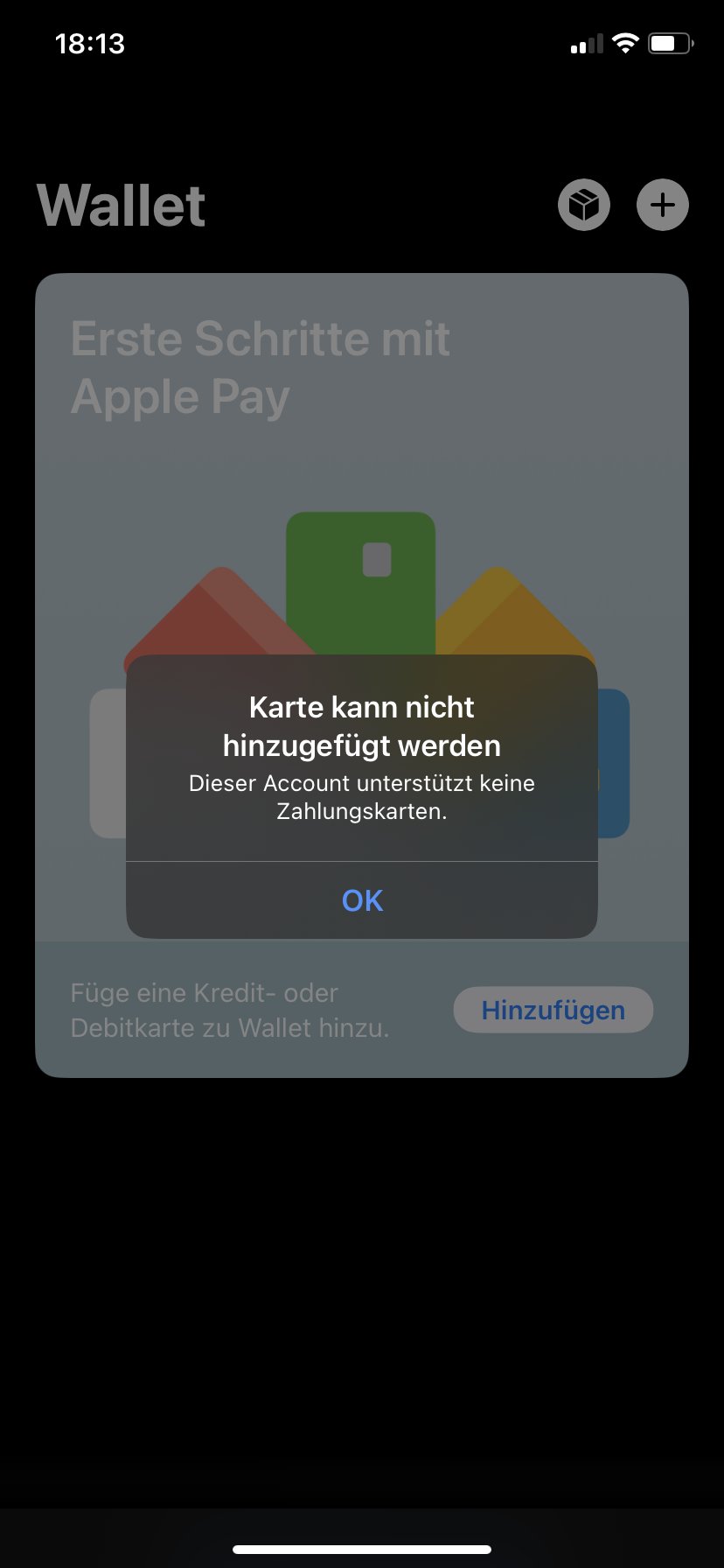 Er ist 13 Jahre alt und hat ein iPhone XR und wir wohnen in Hessen…. Immer wenn man zu der App Wallet 💳 geht und das ,,+‘‘ drückt, kommt das :