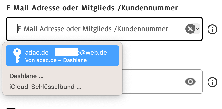 ich nutze den Passwortmanager Dashlane zusammen mit Safari. Meine Anmeldedaten liegen im Tresor von Dashlane, die Dashlane-Erweiterung unter Safari soll dafür sorgen, das bei Anklicken des entsprechenden Feldes automatisch von Dashlane die Daten eingetragen werden. Dazu dient das "Schlüsselsymbol" welches als erstes unter den Feldern '"Mitgliedsnummer" und "Passwort zu sehen ist. Dies funktioniert aber nicht - ich muss immer auf den Punkt "Dashlane" klicken, damit im Hintergrund der Tresor aufgerufen wird und dann die Daten eingetragen werden. Dies ist ein Schritt mehr. Ich habe den Dashlane Support angeschrieben - nach ein paar Mails hin und her kam dann die Antwort, das der "Fehler" bei Apple liegen würde und sich damit der Support außer Stand sieht, hier für Abhilfe zu sorgen. Die entsprechenden Felder für "automatisch Ausfüllen" sind bei Safari richtig gesetzt, Touch-ID ist ausgeschaltet, die App aus dem App-Store heruntergeladen und damit alle Erweiterungen ebenfalls. Ich komme hier nicht weiter - hat jemand von euch das Problem auch schon gehabt und gelöst? Ich würde gerne "nur" auf den Schlüsselbund klicken und der Rest läuft dann im Hintergrund. Zur Verdeutlichung habe ich Euch ein Bild beim versuchten Einlogen auf der ADAC-Webseite gemacht. Die blaue Unterlegung sollte das Programm machen und tut es nicht.