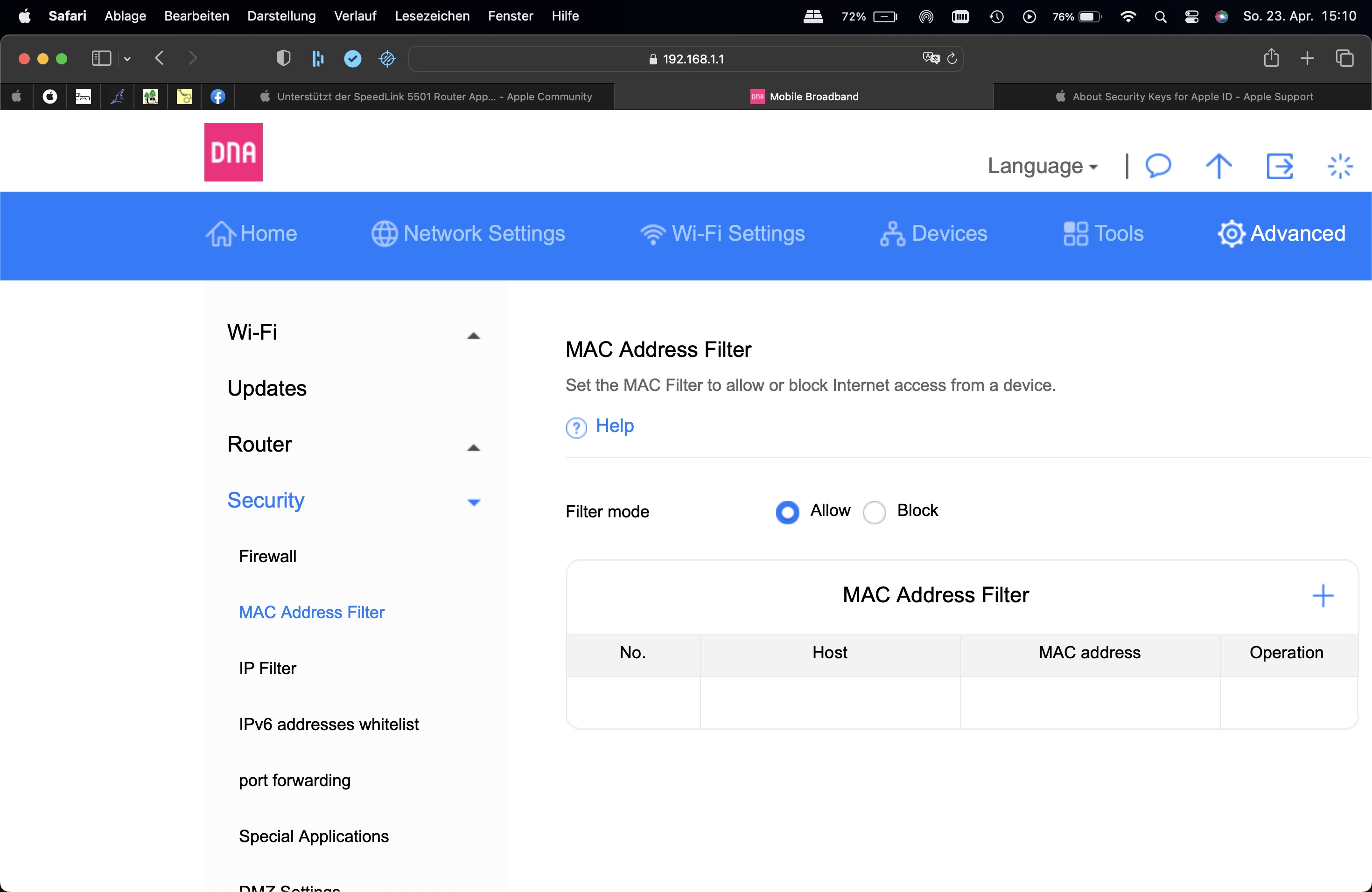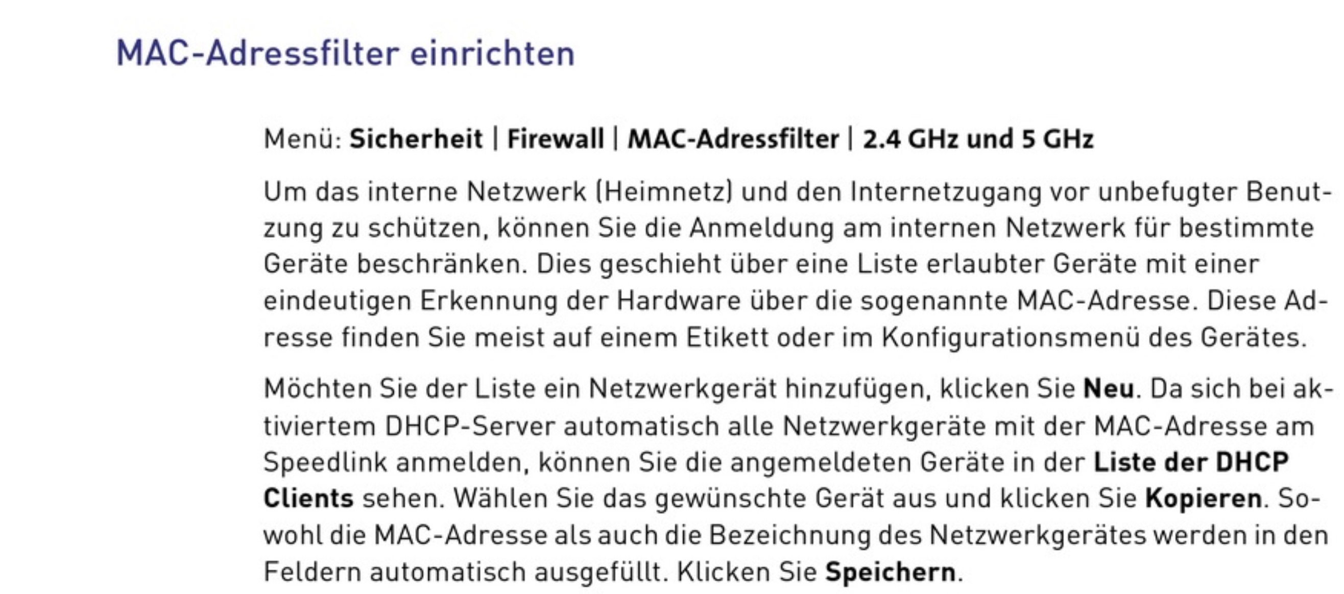 Wenn der Mac Adress Filter aktiviert ist dann hast Du 2 Lösungen: