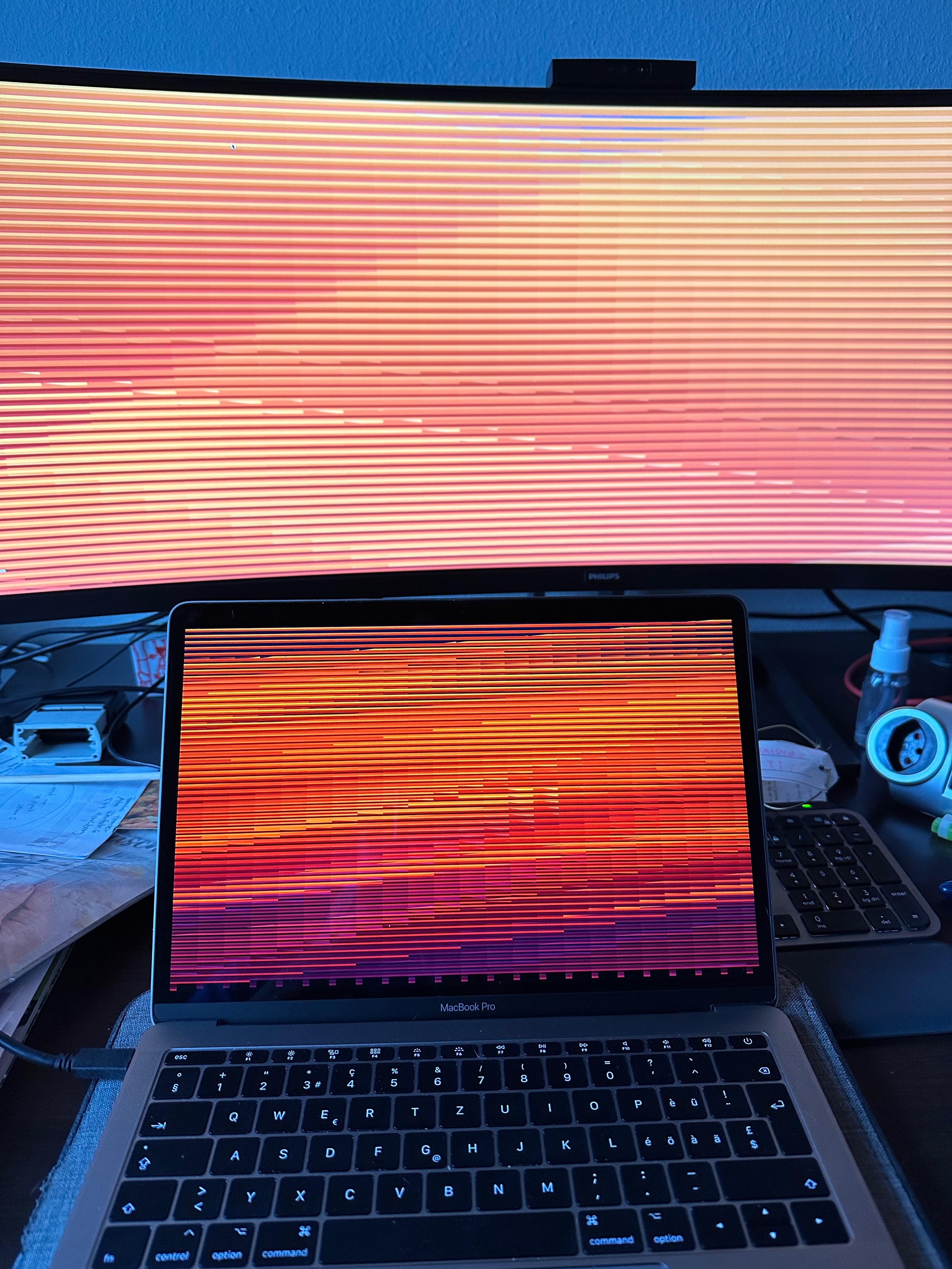 Seit einiger Zeit erscheint nur noch ein verzerrtes Bild, wenn ich mein MacBook Pro an den Philips 499P Monitor via USB-C anschliesse. Dies war vorher nicht der Fall und ich konnte den Bildschirm normal nutzen. Leider weiss ich nicht mehr, welche Aktion dies ausgelöst hatte, aber ich vermute, dass dies nach einem Update änderte.