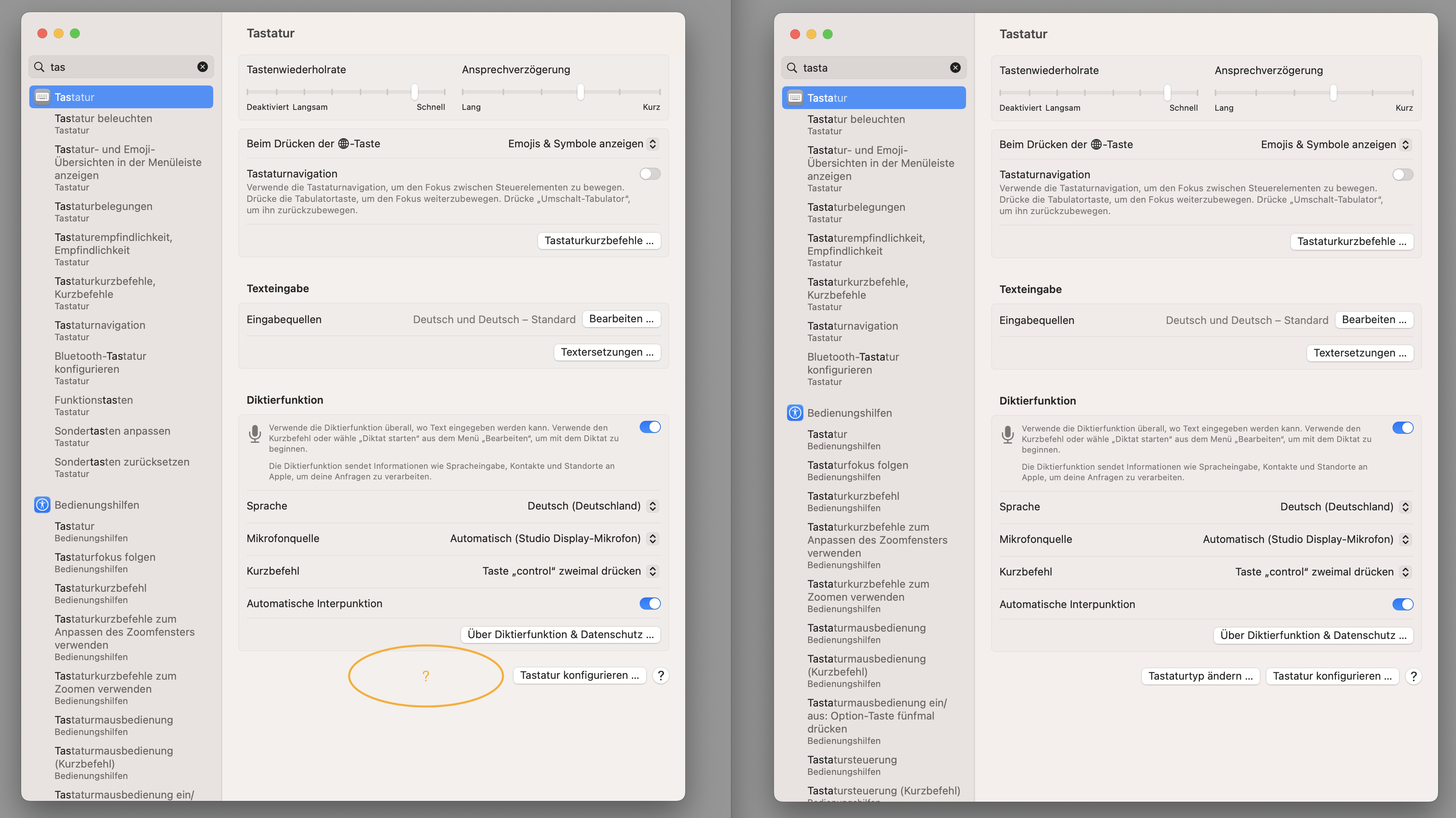 Im Screenshot links: fehlender Button „Tastaturtyp ändern …" den ich aber brauche um auf ISO umzustellen.