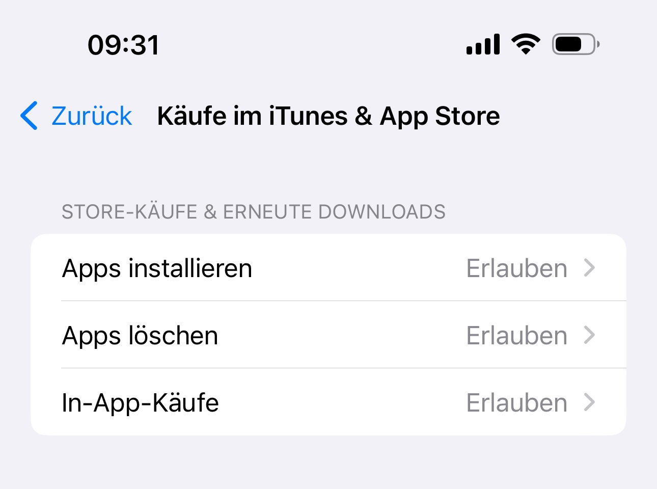 - In Bildschirmzeit > Beschränkungen > Käufe im iTunes & App Store > Apps löschen, wähle "Erlauben".
