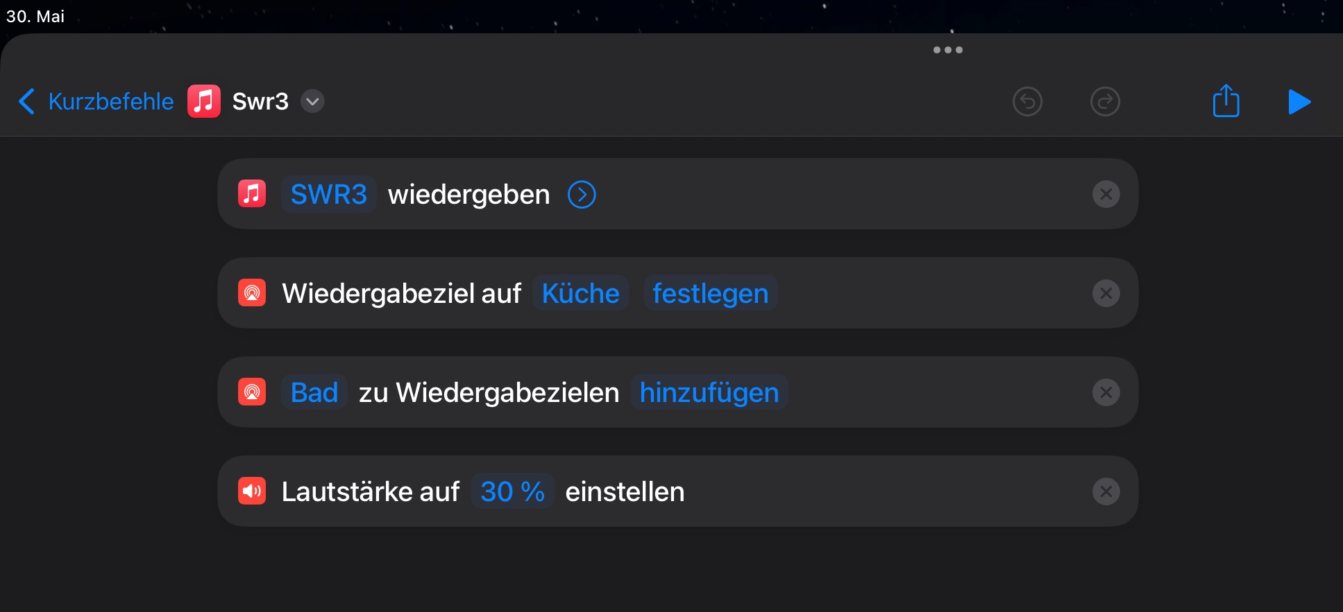 Leider funktioniert das nicht mit dem Szenennamen "SWR3". Damit versucht Siri wieder den Start über TuneIn und wir landen beim bekannten Problem.