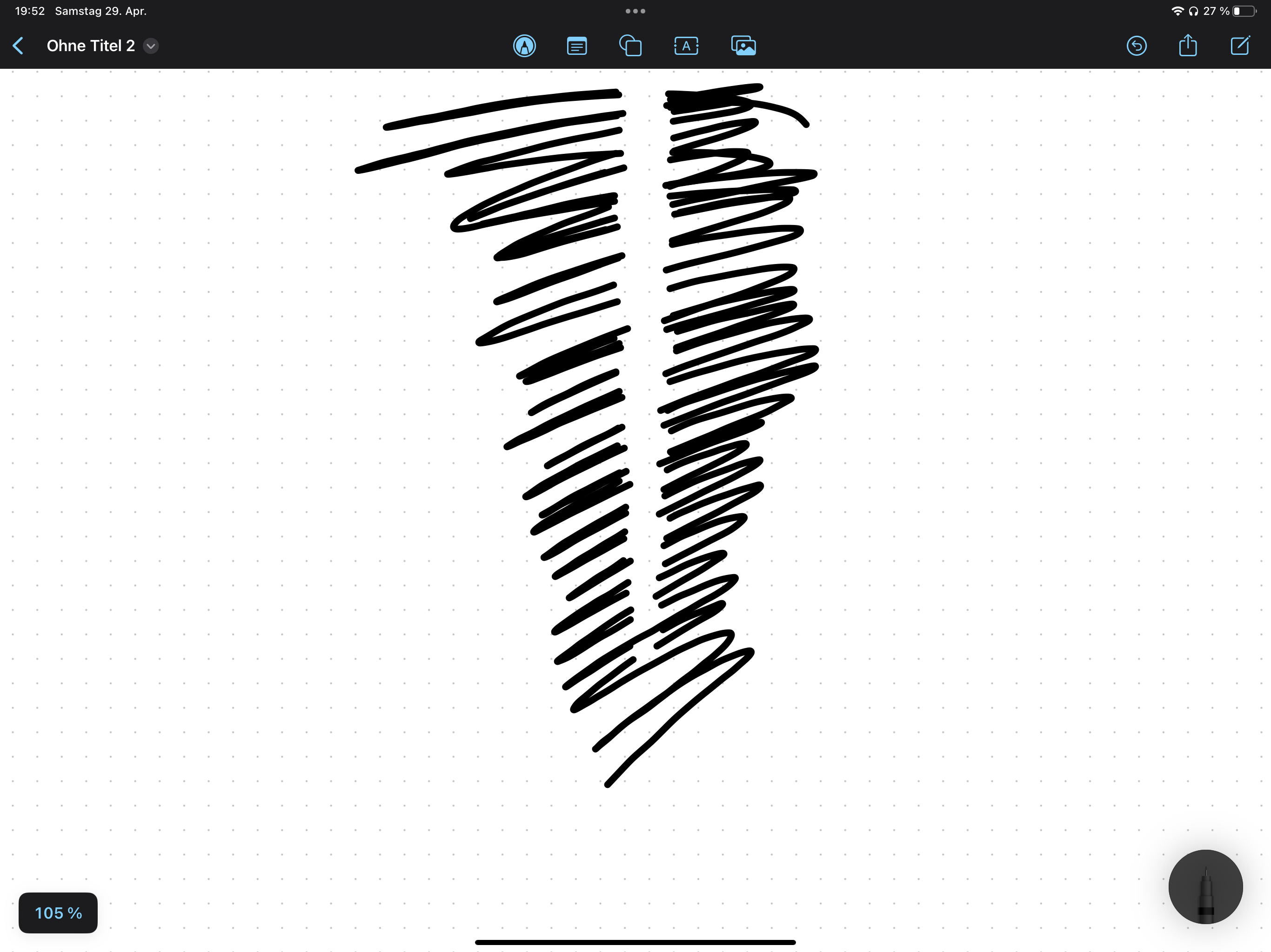 Ich habe ein IPad Pro der 5. Generation und besitze dazu einen Apple Pencil der 2. Generation. Seit wenigen Tagen schreibt dieser allerdings nicht mehr in diversen Schreibprogrammen (GoodNotes, Notizen, Freeform etc.) nicht mehr richtig. Und zwar lässt er beim Schreiben unterhalb der magnetischen Haltevorrichtung eine ca. 1cm breite Lücke. Quasi setzt der Pencil während des Schreibens über diesen Bereich des IPads ab. Dieser Bereich geht ca. bis zur Hälfte des Display und zeichnet dann ganz normal weiter. Siehe im Bild.