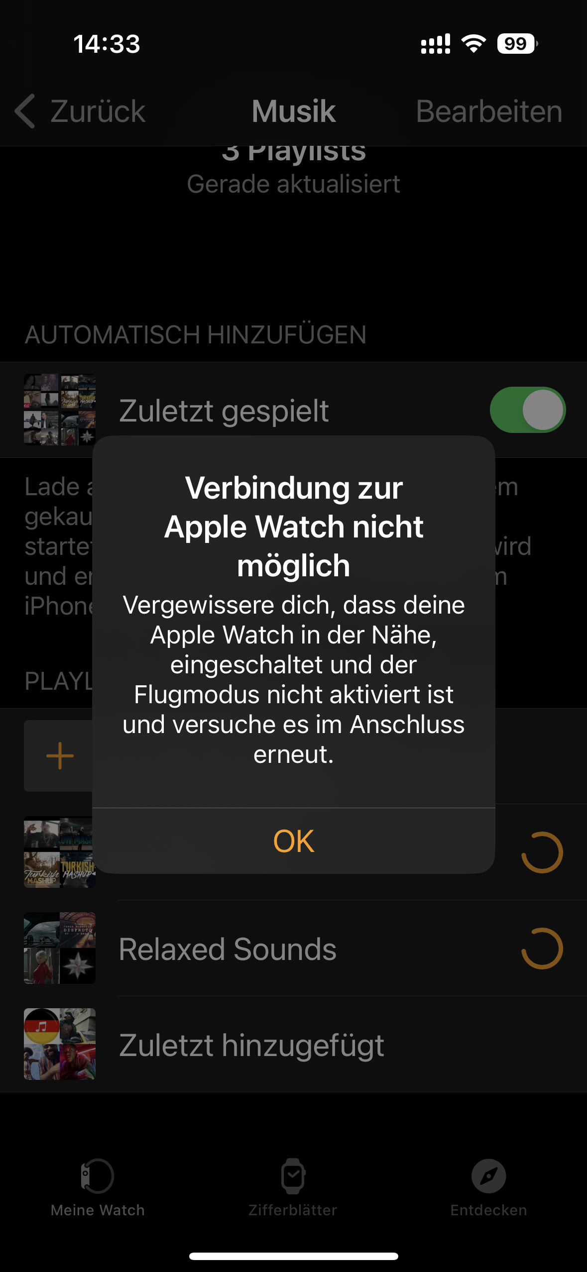 danke für deinen Beitrag. Das ist natürlich nicht so schön und kann viele Ursachen haben. Stelle bitte zuerst sicher, dass auf dem iPhone und der Apple Watch sämtliche Updates gemacht wurden. iOS auf dem iPhone, iPad oder iPod touch aktualisieren & Apple Watch aktualisieren - Apple Support