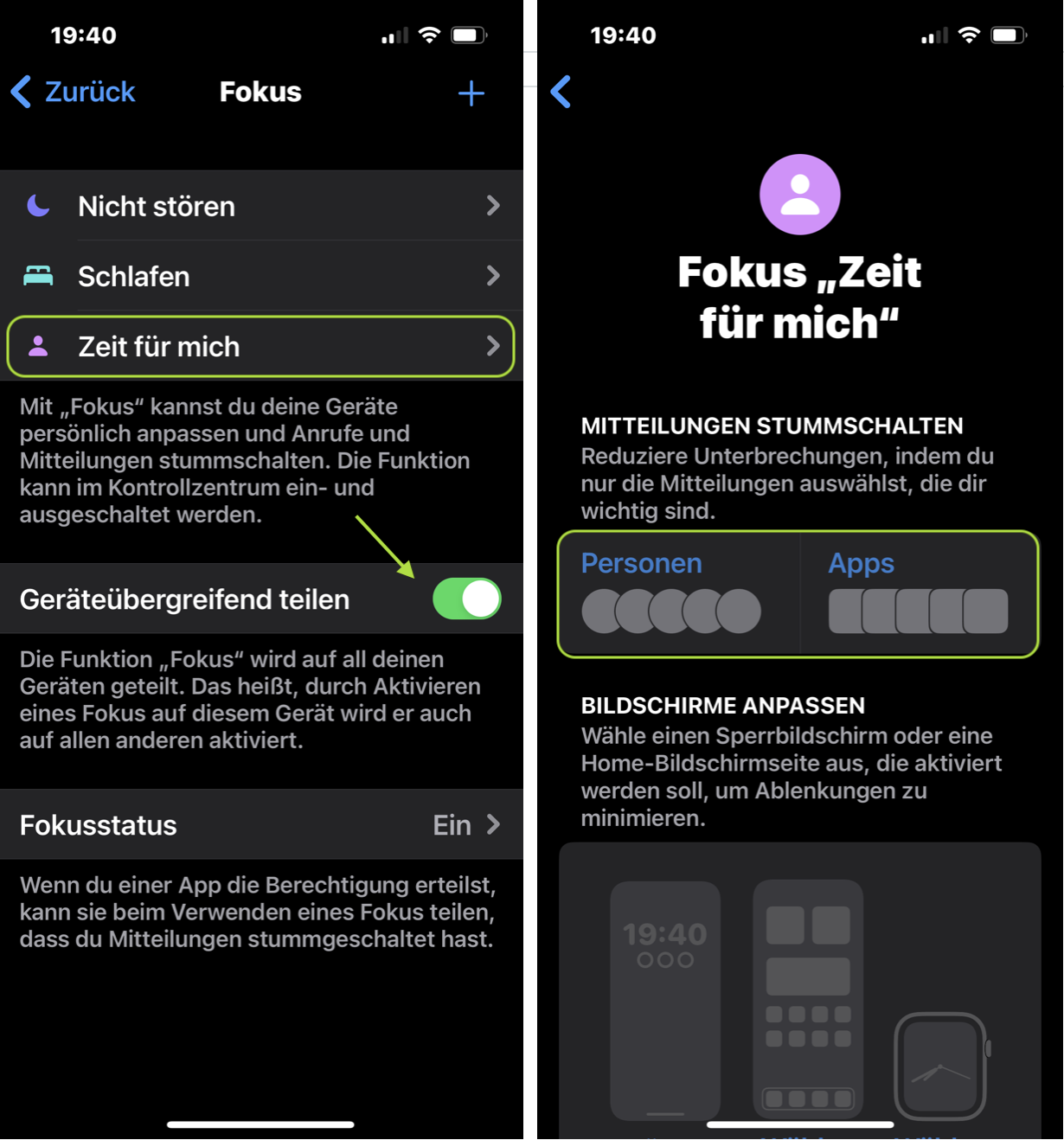 ich nutze den Fokus „Zeit für mich“, wenn ich ein Workout mache, damit ich währenddessen keine Push-Mitteilungen erhalte.