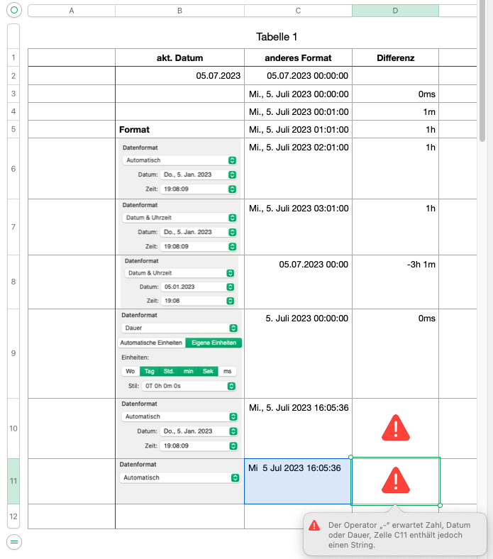 D3 bis D9: Ich bin zufrieden, obwohl das Quellformat für die Subtraktion nicht "Dauer", sondern "Dat/Zeit" (C7...), ja sogar "Auto" (C6) ist. Zellen c10…c11 sind „von Hand“ eingetragen.