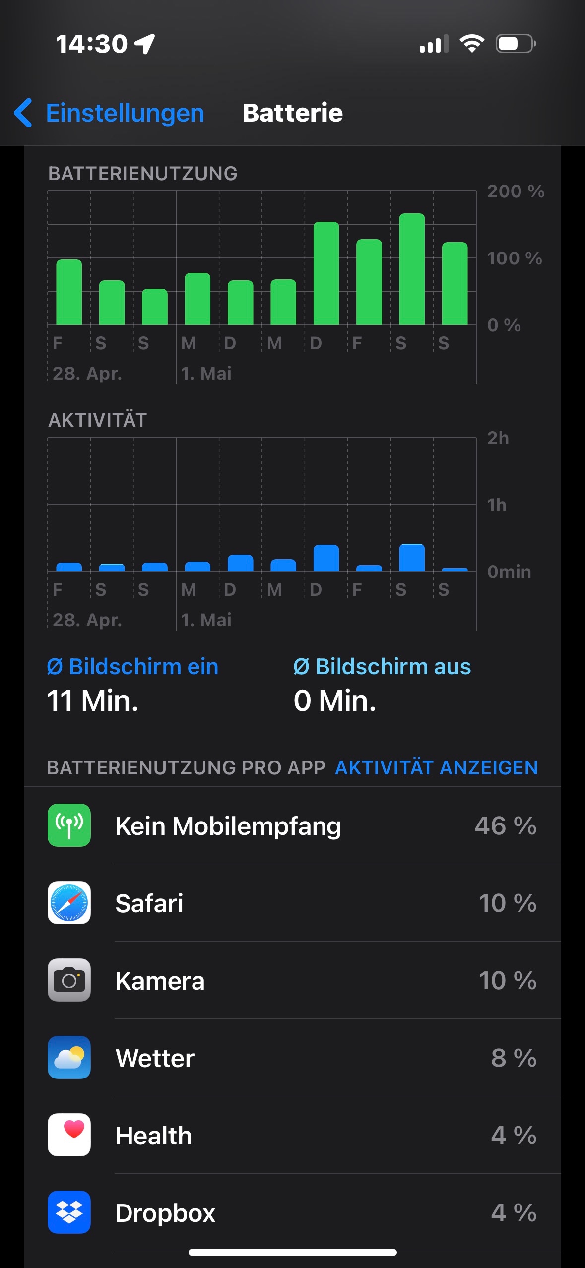 Akku des iPhone 14 pro entlädt sich schnell ohne Hintergrundaktivitäten. Gerät wird auch im Ruhezustand manchmal sehr warm - besonders bei schlechten Empfangsbedingungen. Mache ich bei der Bedienung etwas falsch oder hat der Akku einen Fehler?