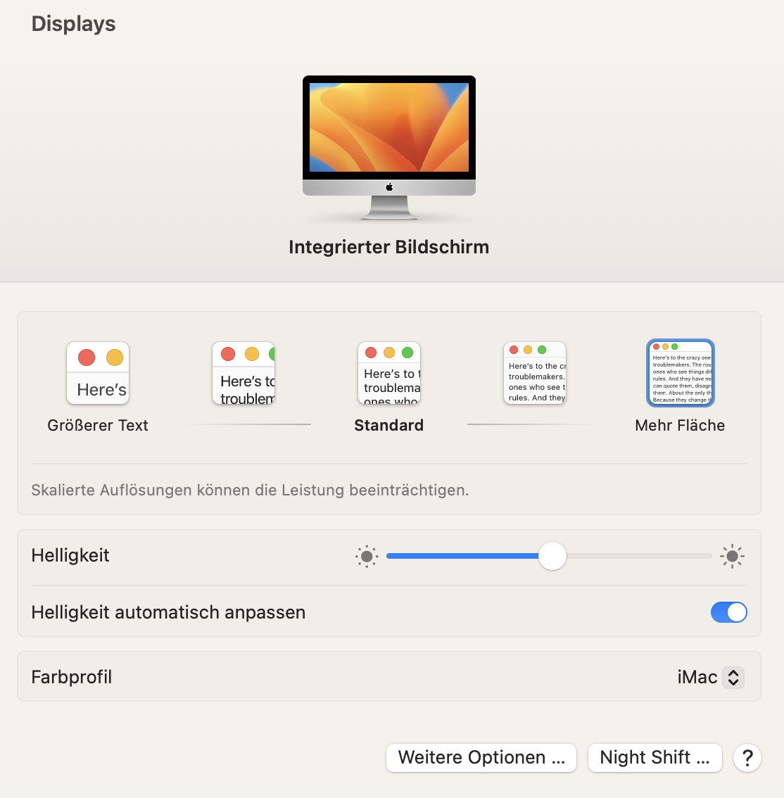 Ich arbeite mit einem Retina 5K, 27-inch, 2017 und Ventura 13.3.1.