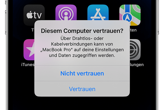 Verbinde nun erneut dein iPad mit deinem Mac, eine Abfrage zum Vertrauen des Gerätes sollte erscheinen. Tippe hier auf "Vertrauen", ggf. auch auf deinem Mac: