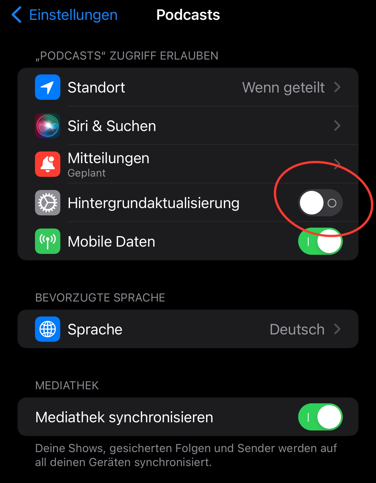 ach ja, automatische downloads habe ich in podcasts schon deaktiviert. die podcasts, die ich höre, sind in so gut wie allen fällen (manuell) heruntergeladen.