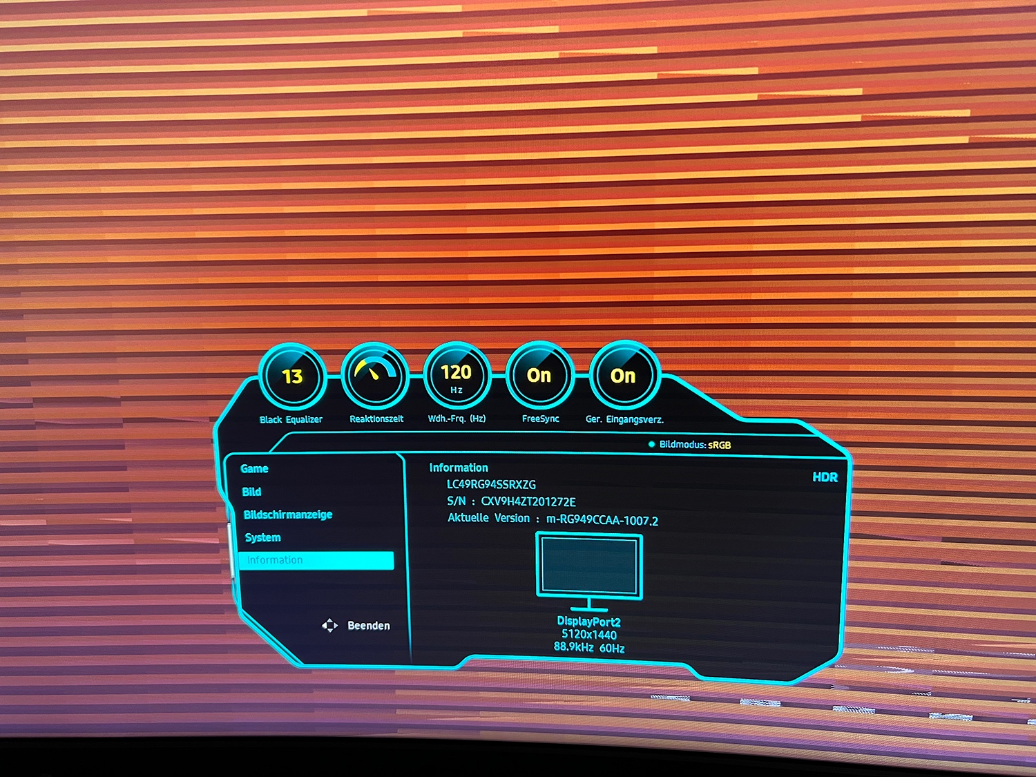 Ich habe nun über den Thunderbolt (USB-c) Anschluss einen Samsung 49 Zoll Display mit 5120x1440 Auflösung angeschlossen. Ich habe jetzt schon viele Kabel probiert und immer wieder bekomme ich folgendes Ergebnis (siehe Foto):