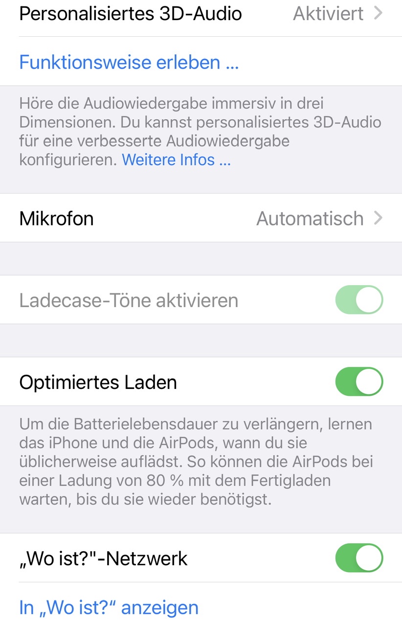 Ich habe jetzt alles versucht: Mit iPhone, mit Macbook. Habe sie neu verbunden. Bei "wo ist" wird mir die Option "beim zurücklassen benachrichtigen" überhaupt nicht angezeigt, und es gelingt mir nicht, die Ladecase-Töne auszuschalten. Was ist falsch?