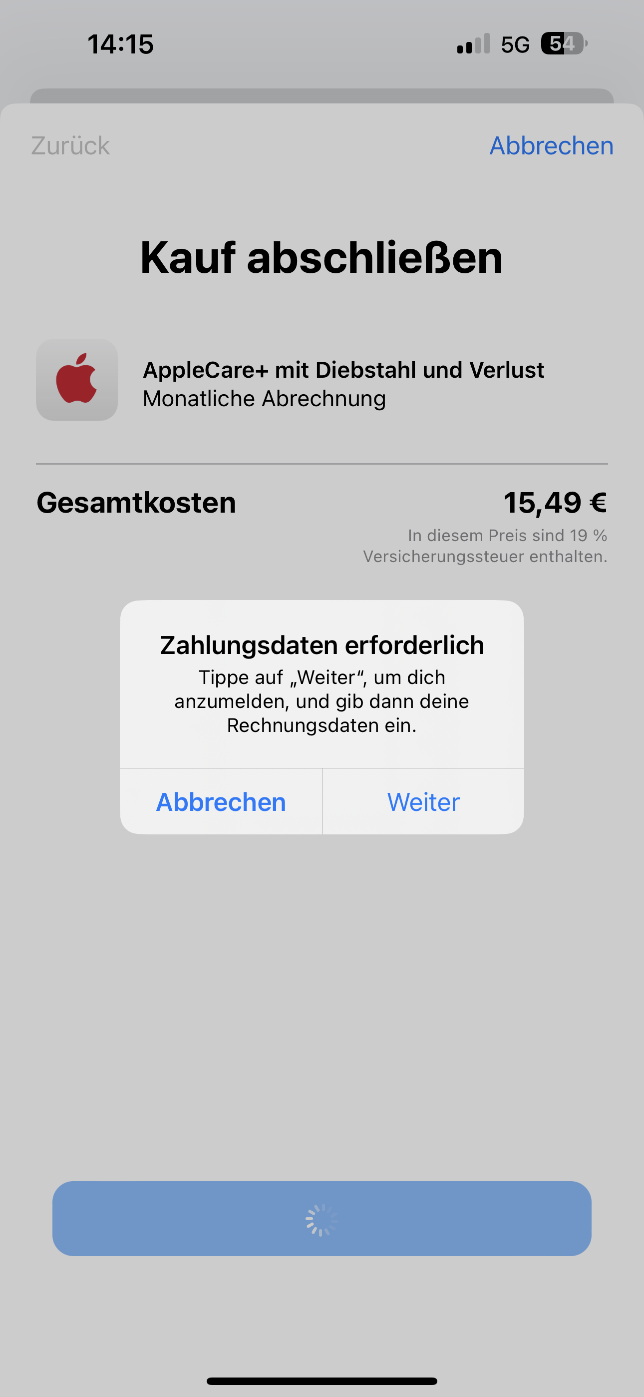 ich wollte Apple Care abschließen über mein Mobilfunkanbieter ich habe die Zahlungsinformation hinzufügt aber der schließt es nicht ab