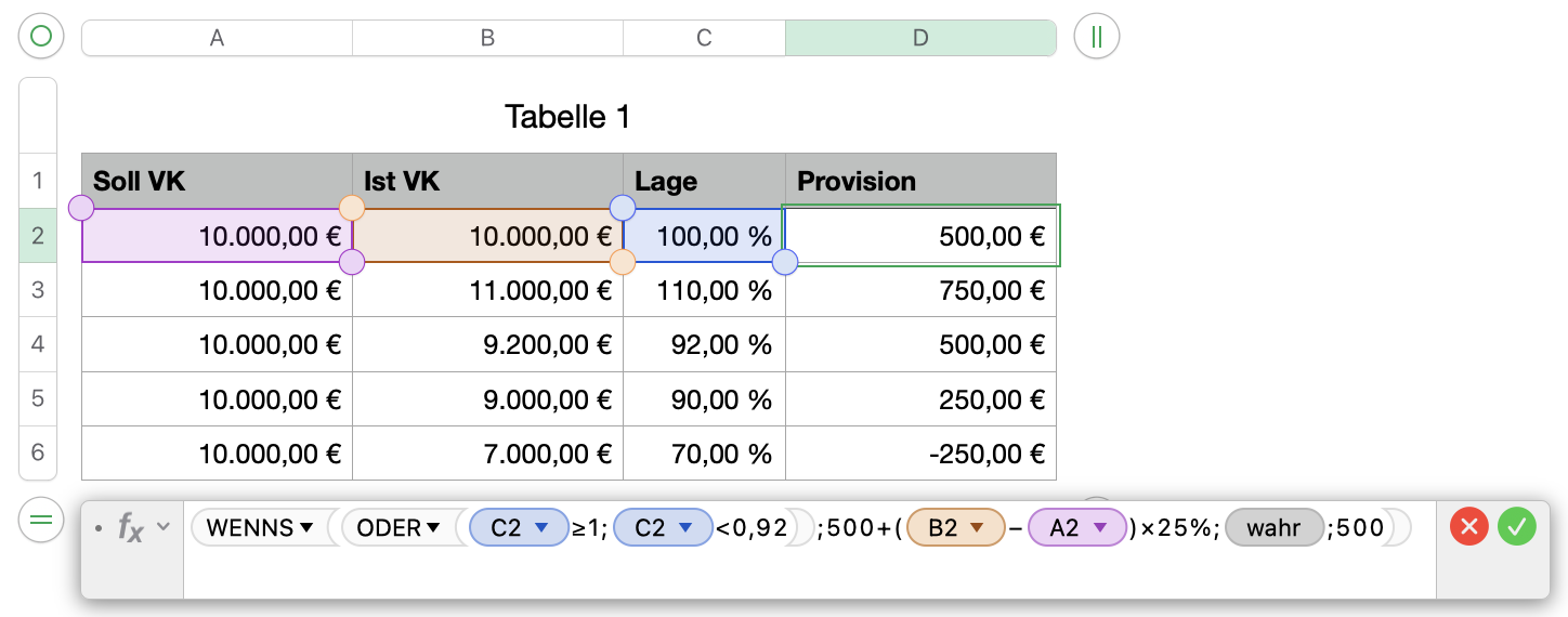 =WENN(Verkaufspreis > Grundpreis, (Verkaufspreis - Grundpreis) * 0.15, WENN( UND(Verkaufspreis < Grundpreis, (Grundpreis - Verkaufspreis) > Grundpreis * 0.05), (Grundpreis - Verkaufspreis) * -0.25, 0))