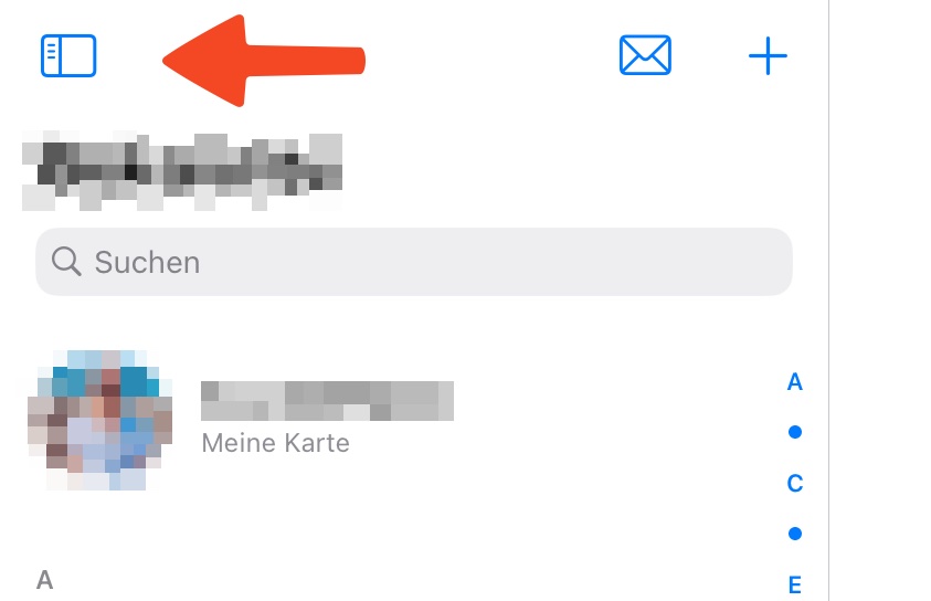 Wenn du die Kontakte App auf deinem iPad öffnest, siehst du ggf. oben links das Symbol zum einblenden der Seitenleist: