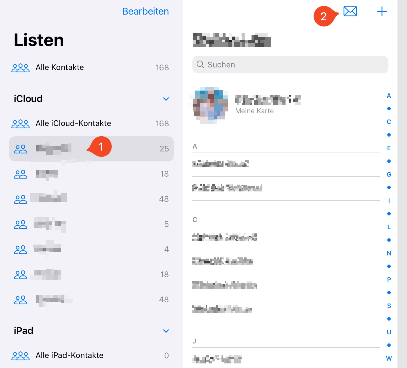 Auf einem iPad kannst du ebenfalls über die Kontakte App eine Mail an eine Liste versenden.