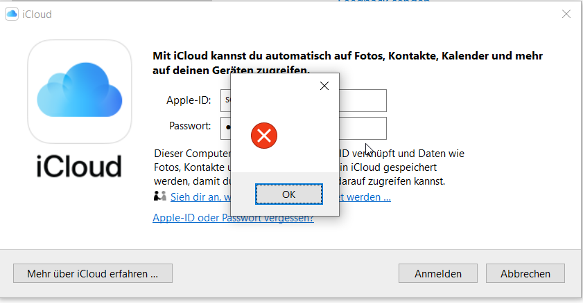 Hallo ich habe nach einiger Zeit festgestellt, dass der sync zwischen ICloud und Windows nicht funktioniert. Bei der Anmeldung gibt es nur ein Error wie im screenshot zu sehen