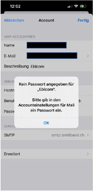 kein Passwort angegeben für Servername Bitte gib in den Accounteinstellungen für Mail ein Passwort ein.