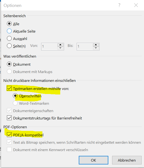 - Wie wird das Inhaltsverzeichnis über Lesezeichen navigierbar gemacht? (Bei Windows kann man das auswählen: Textmarken erstellen mithilfe von Textmarken)