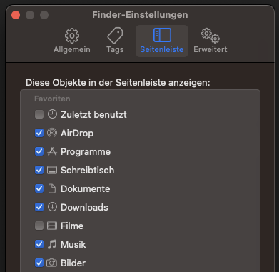 Im Finder kann man wählen, was in der Seitenleiste angezeigt werden soll. Ich will den Ordner «Schreibtisch» anzeigen lassen. Wenn ich dies wähle geht das auch - nach einiger Zeit (womöglich nach Neustart?!) fehlt der Schreibtisch aber jeweils wieder - ich muss die Einstellung ständig wieder vornehmen, was sehr lästig ist...