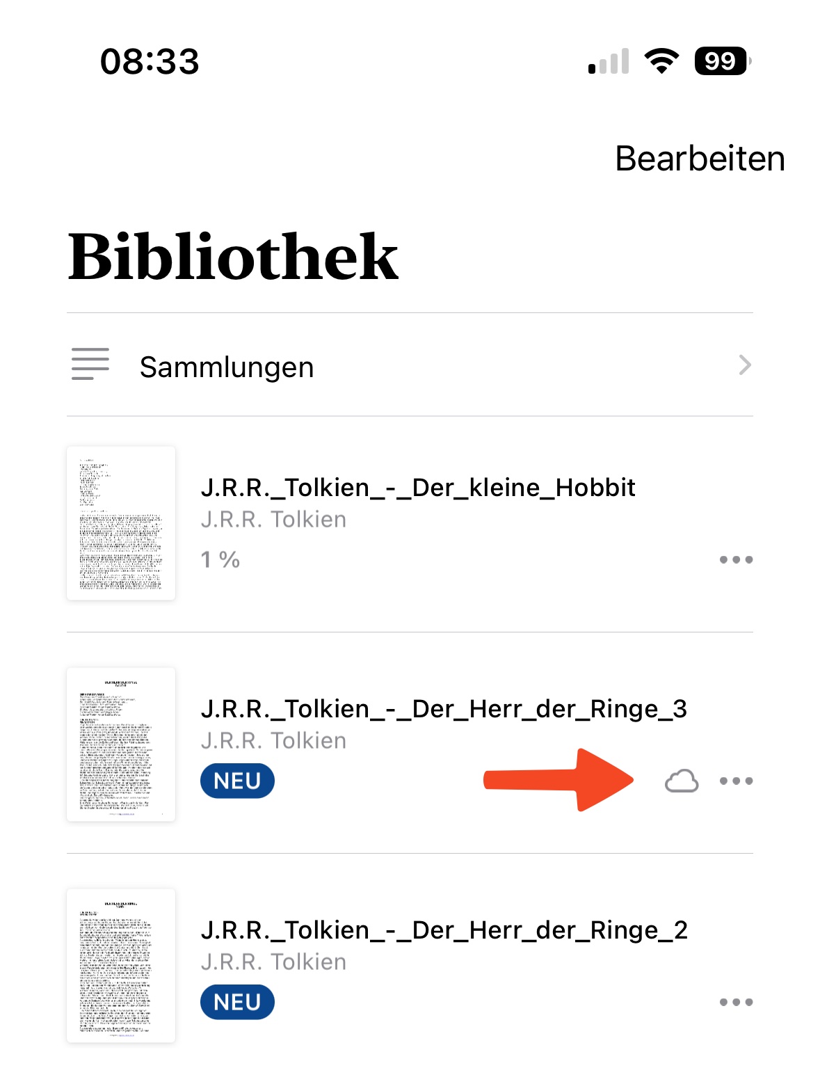 - Achte darauf, dass die PDFs heruntergeladen sind (Wolken = nur in der Cloud). Tippe ggf. auf die drei Punkte und wähle "Download".
